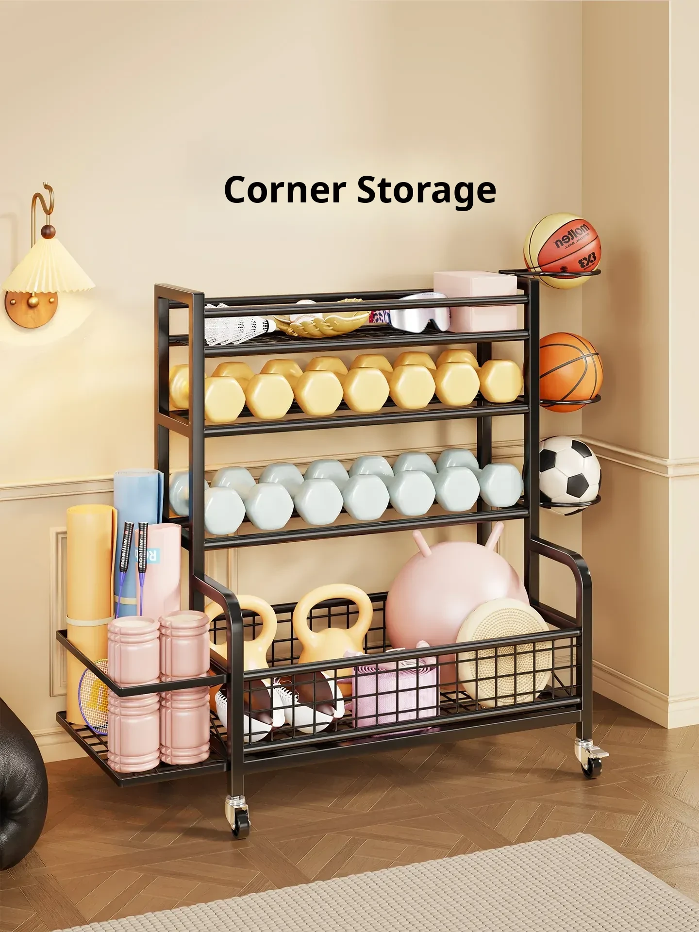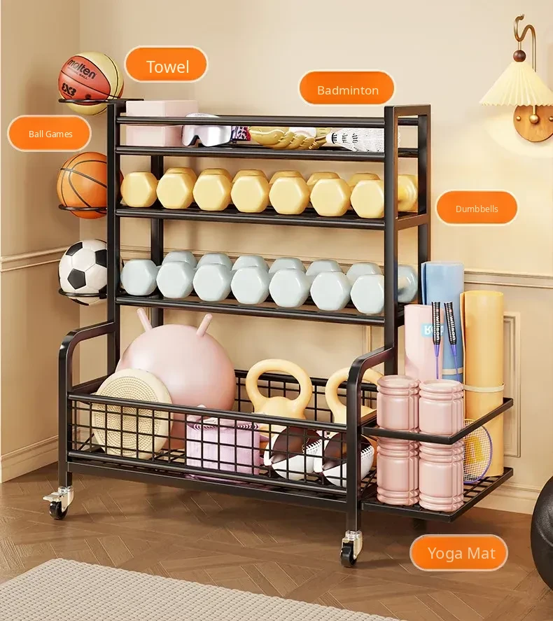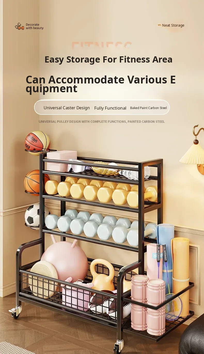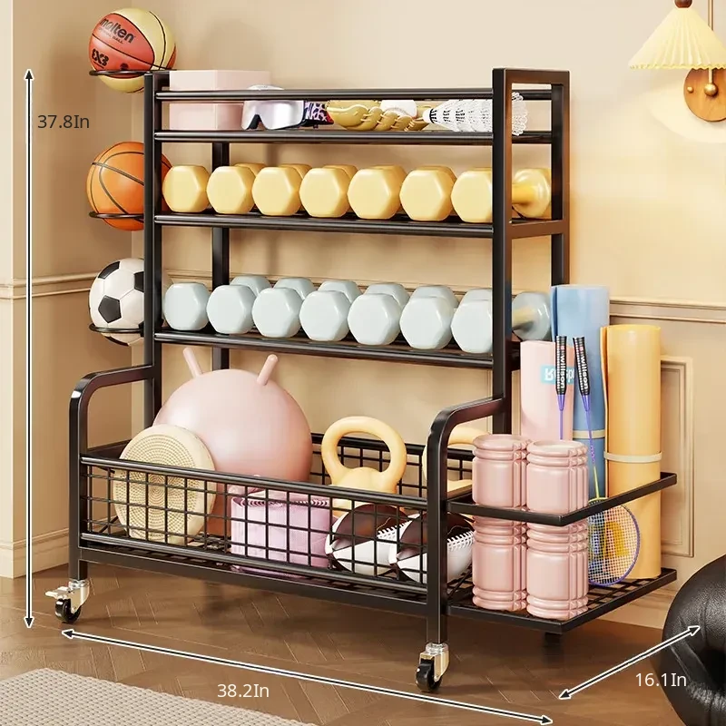 Home Gym Storage Rack on Wheels for Kettlebells, Dumbbells, Basketballs, Foam Rollers, and Yoga Mats - Organize Your Fitness Equipment with Ease!
