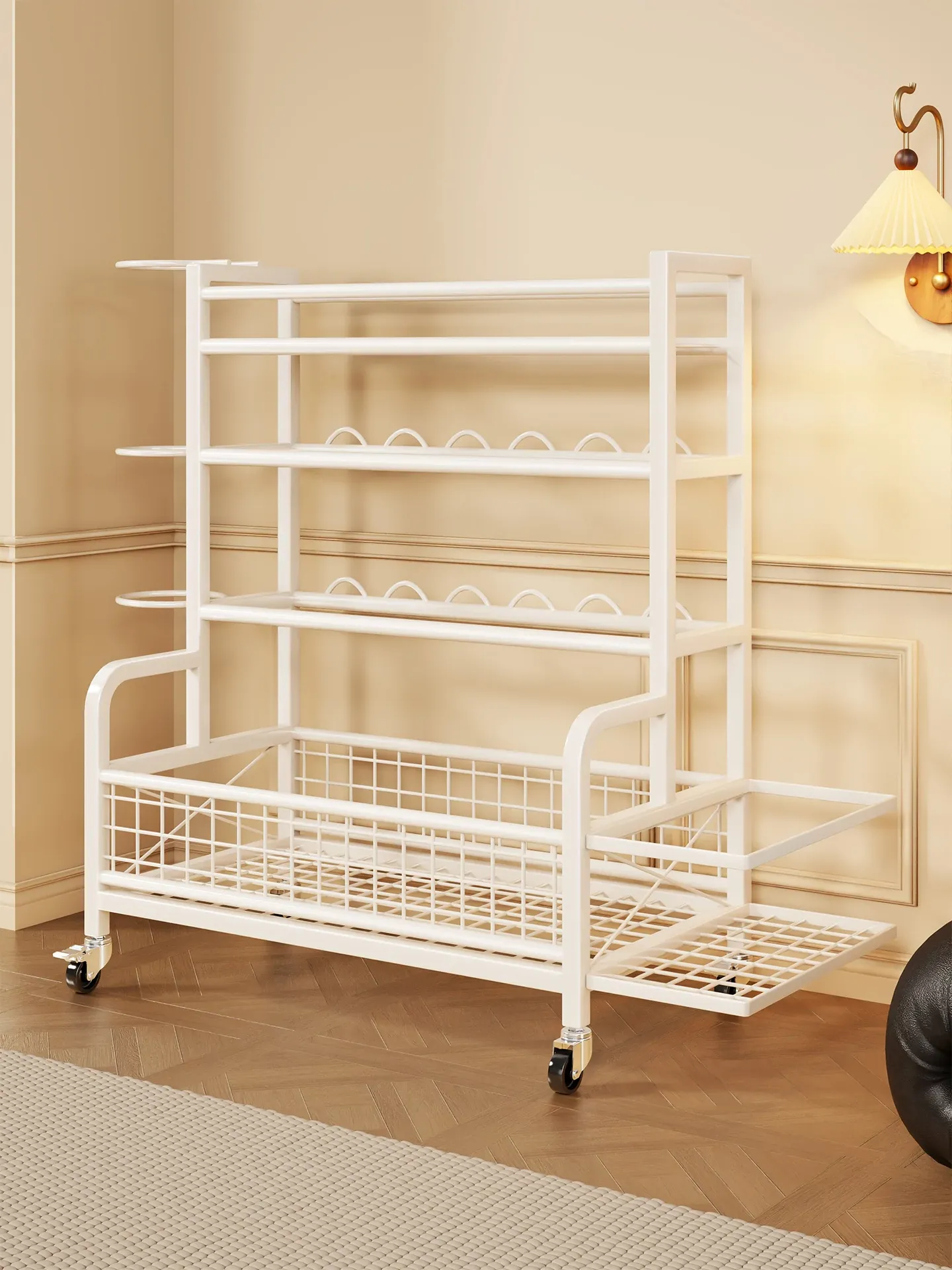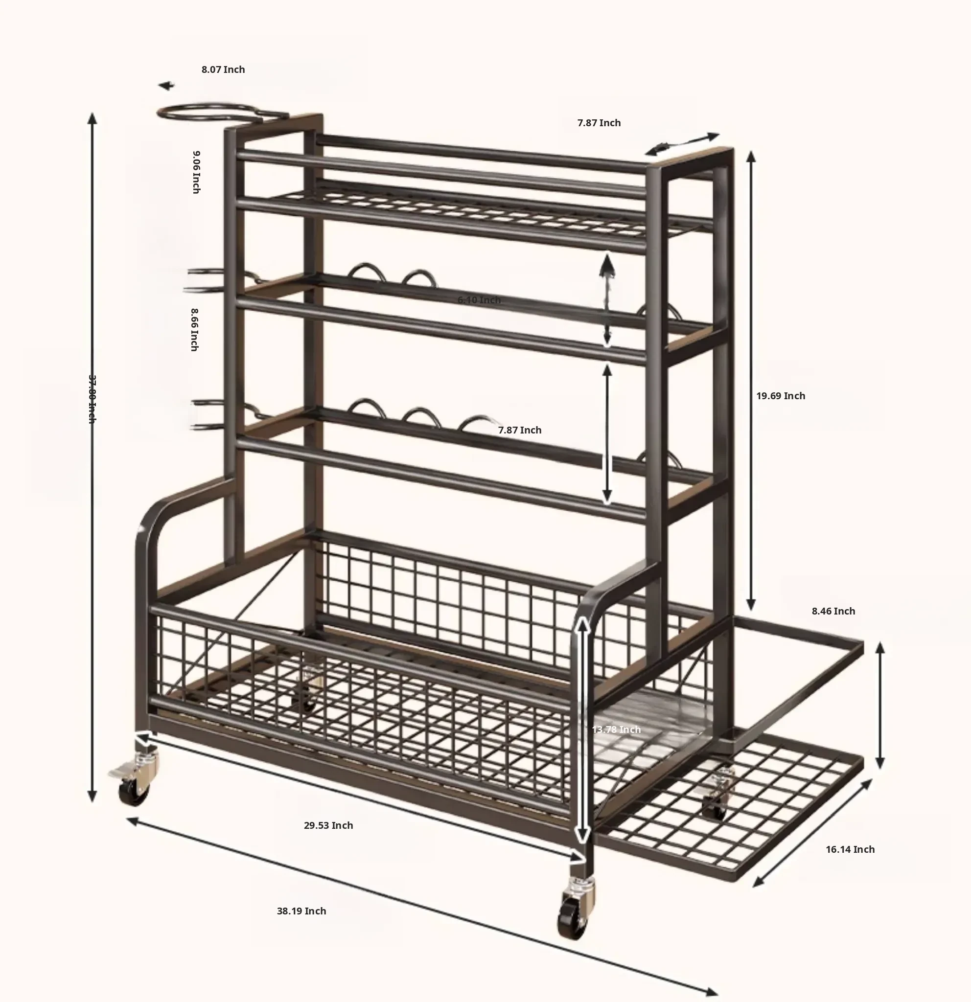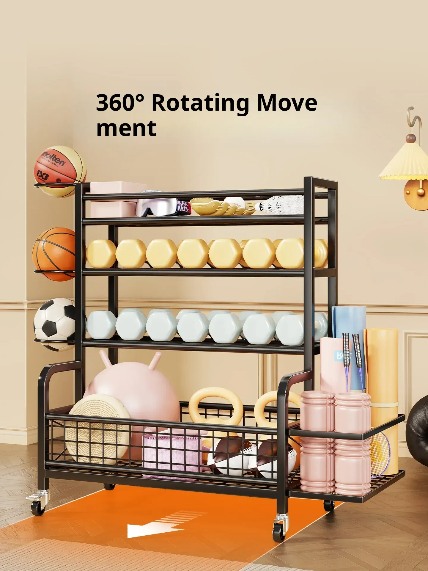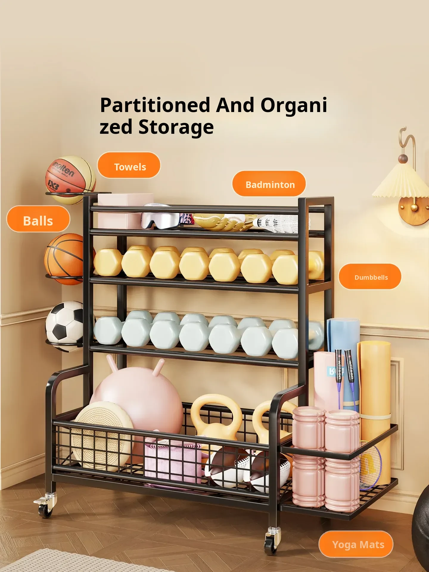 Home Gym Storage Rack on Wheels for Kettlebells, Dumbbells, Basketballs, Foam Rollers, and Yoga Mats - Organize Your Fitness Equipment with Ease!