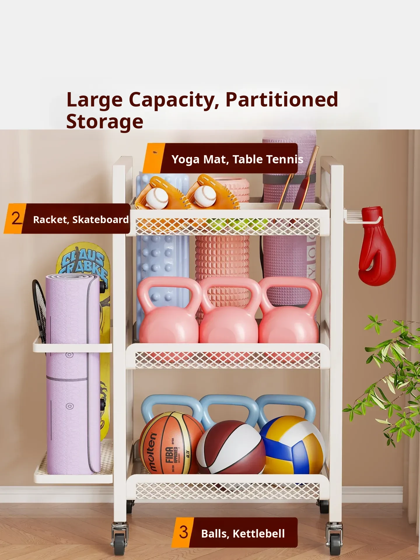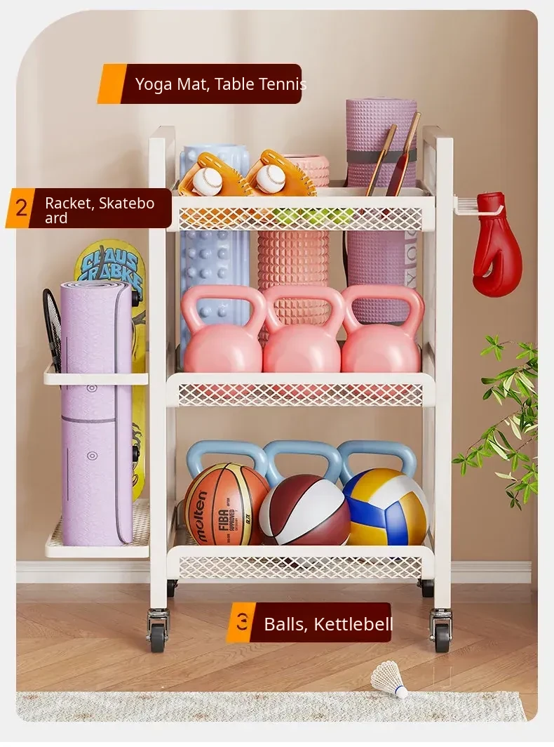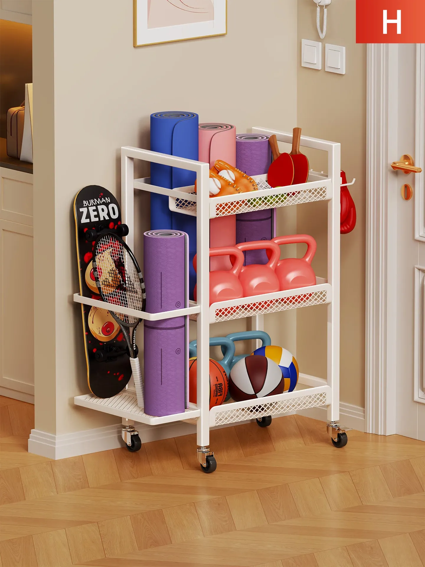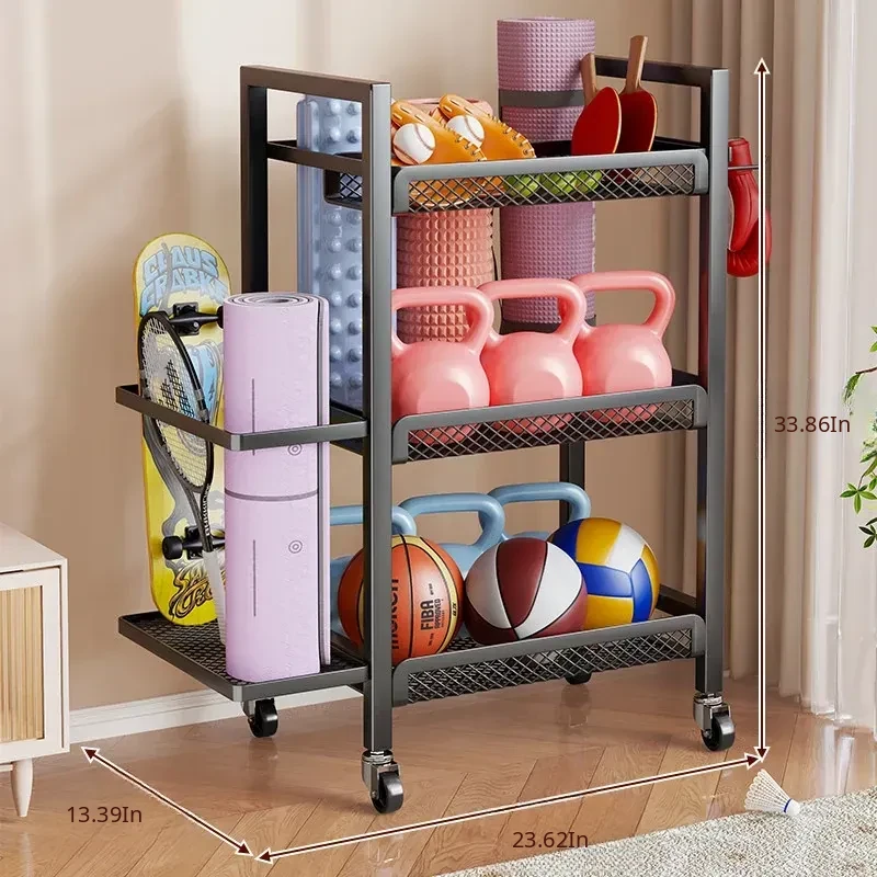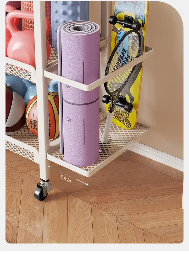 Large Capacity Movable Storage Rack for Fitness Equipment - Organize Your Yoga Mats, Dumbbells, Kettlebells, and Sports Tools at Home! Perfect for Keeping Your Workout Space Tidy and Efficient.