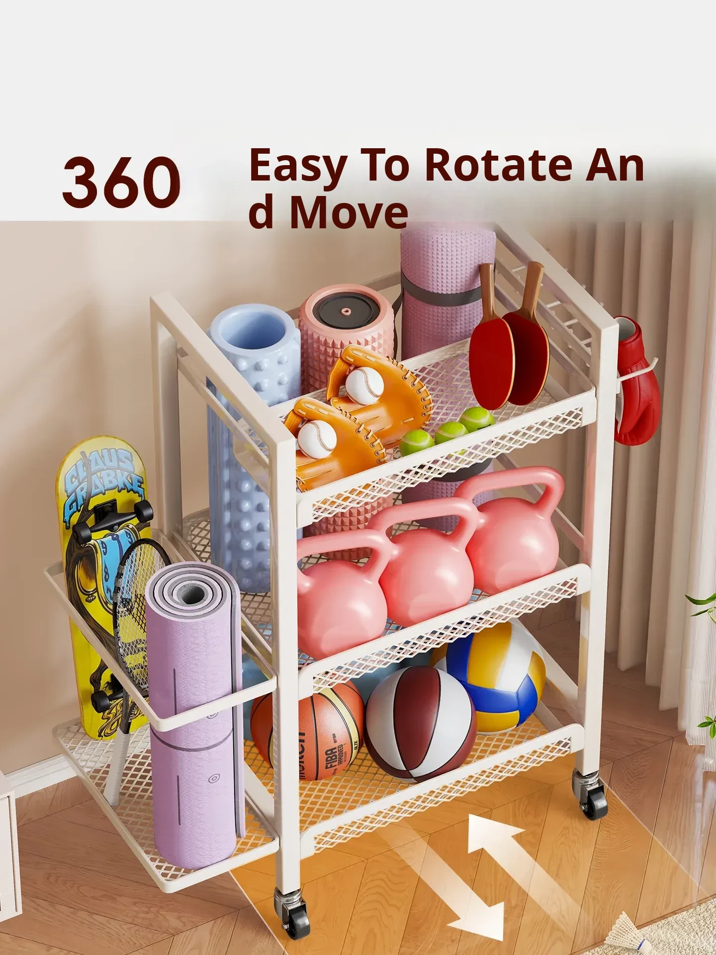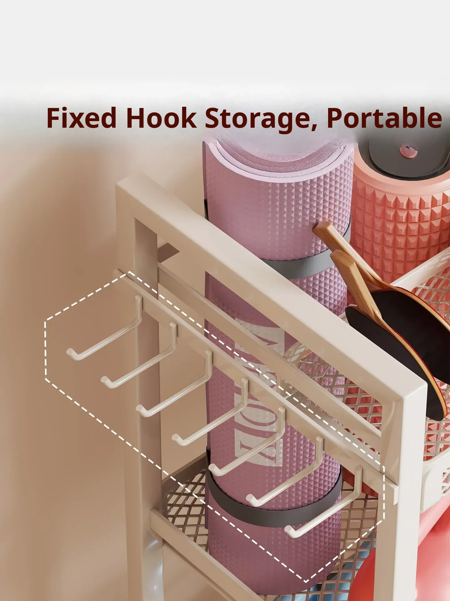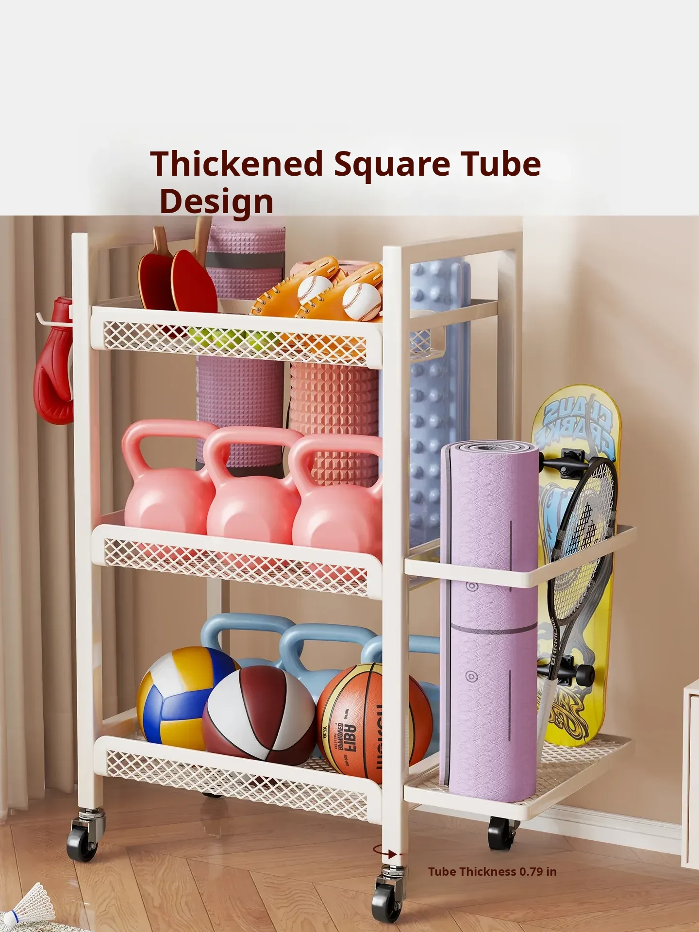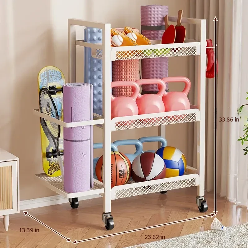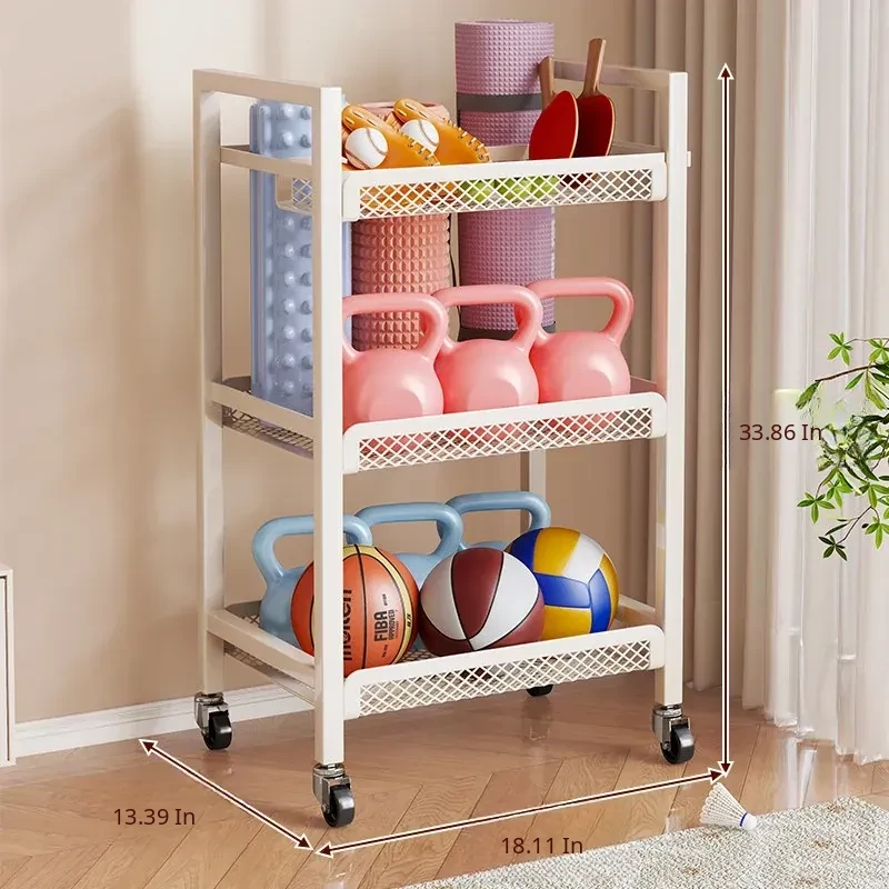 Large Capacity Movable Storage Rack for Fitness Equipment - Organize Your Yoga Mats, Dumbbells, Kettlebells, and Sports Tools at Home! Perfect for Keeping Your Workout Space Tidy and Efficient.