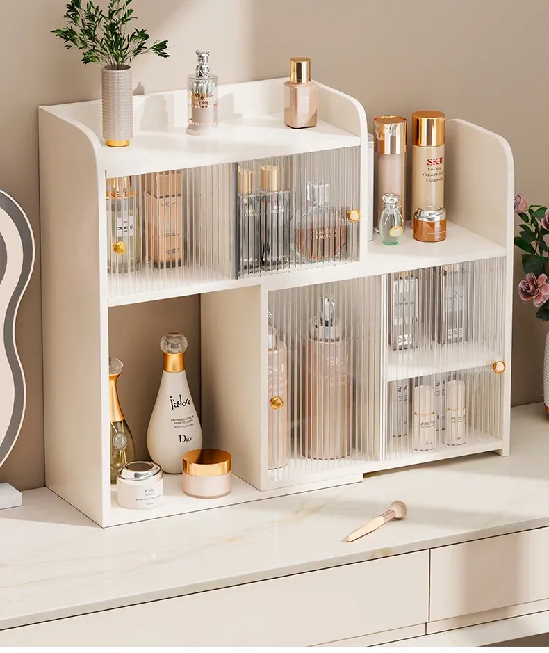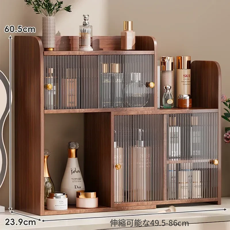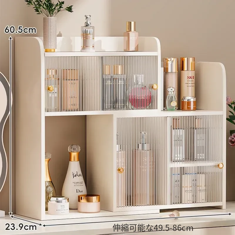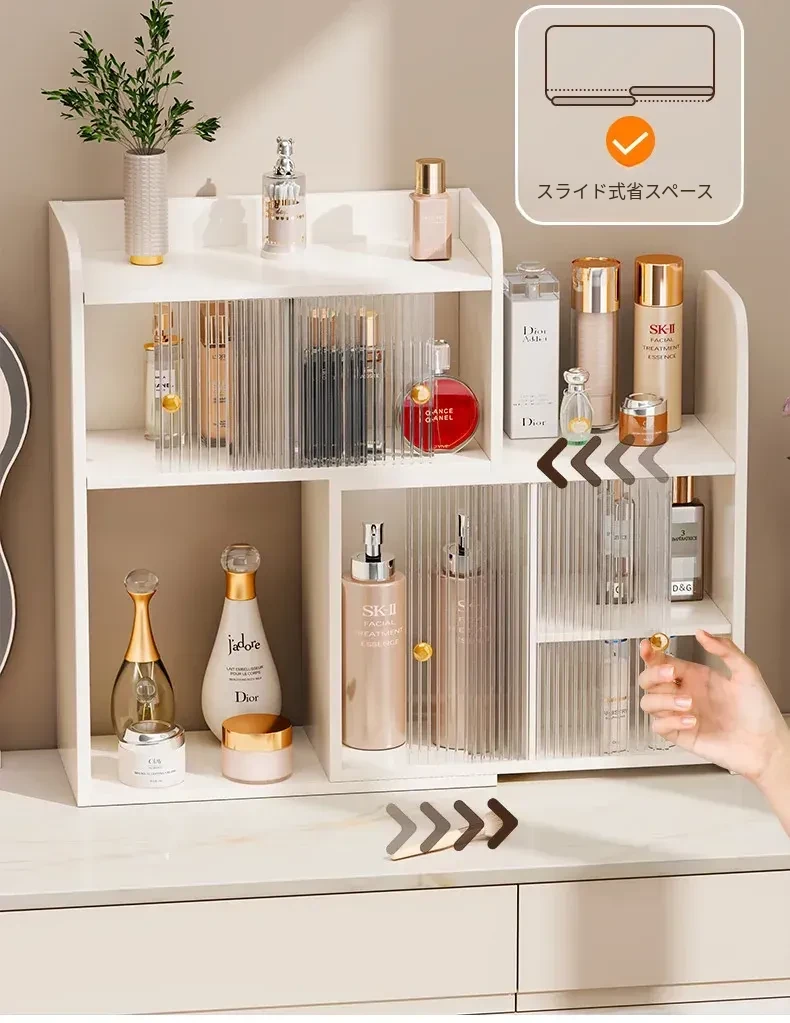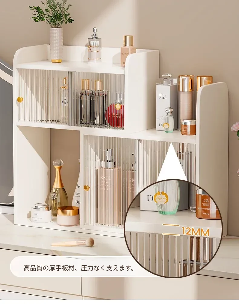 デスク用角型化粧品収納ラック - 高級感あふれるドレッサー用香水キャビネット!スキンケア製品やコスメをすっきり整理できる、スタイリッシュなカップホルダー付き収納ボックスです。