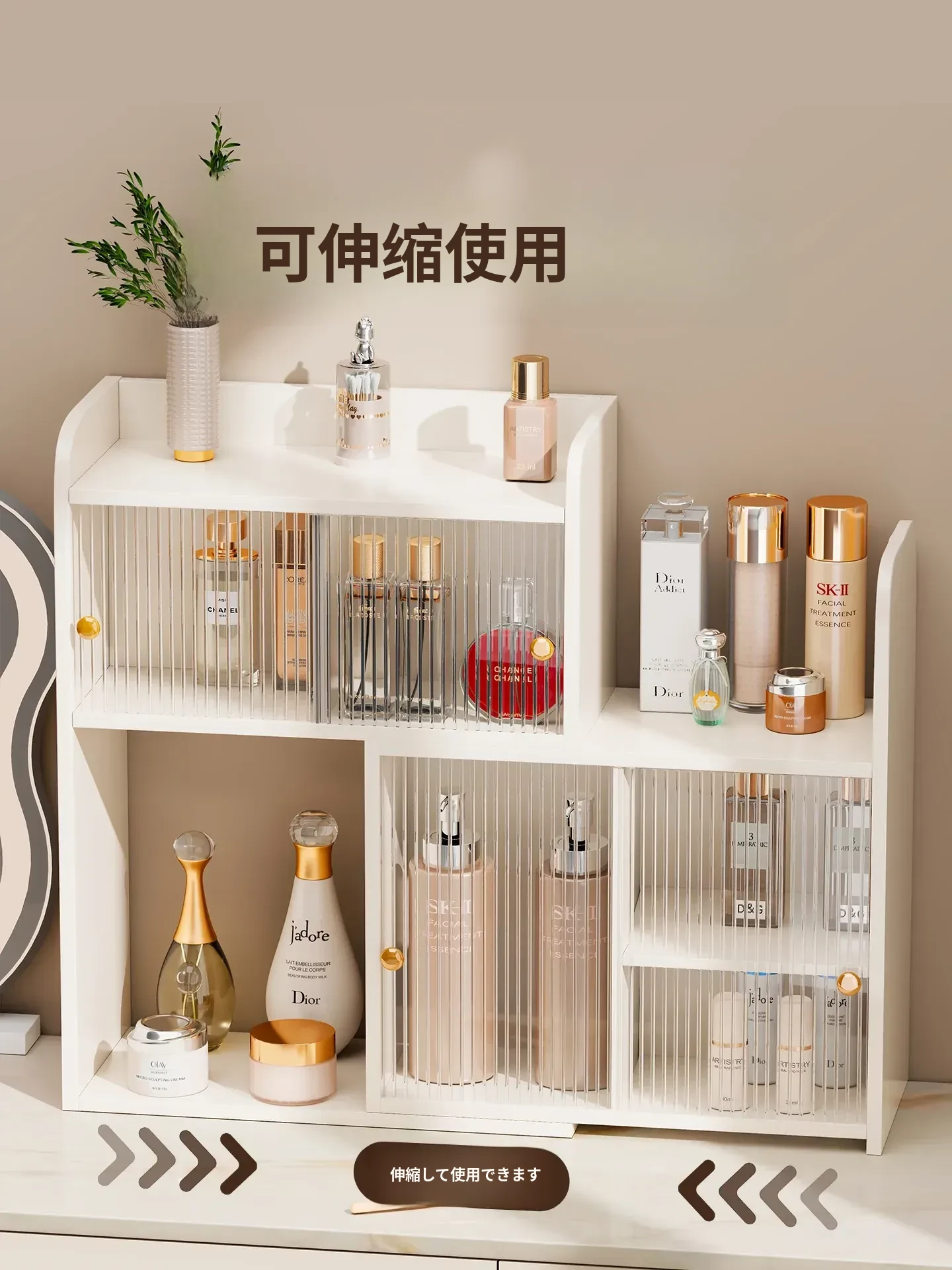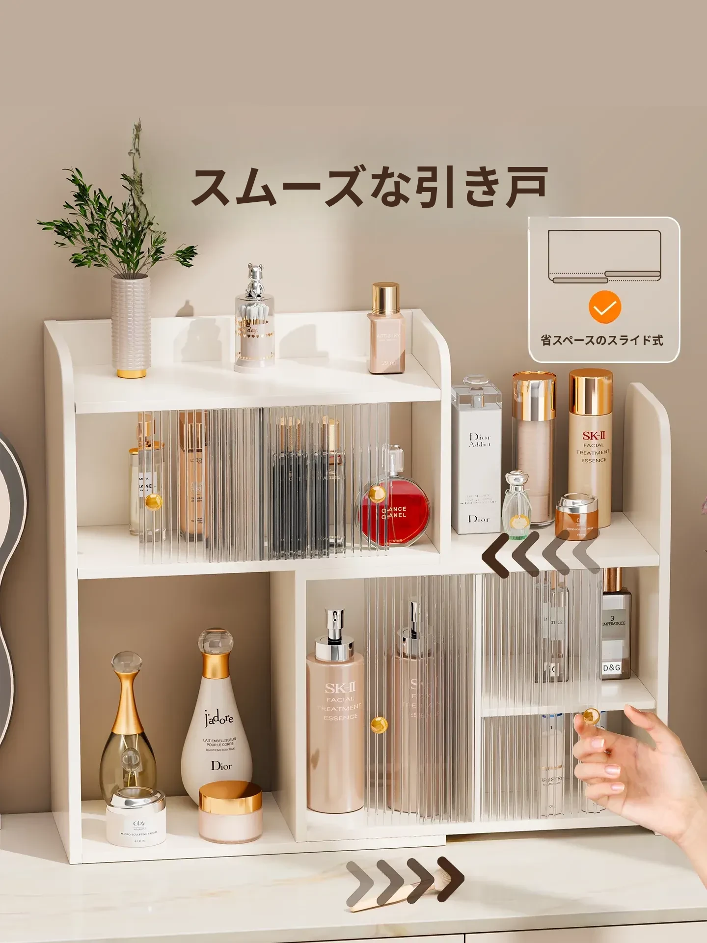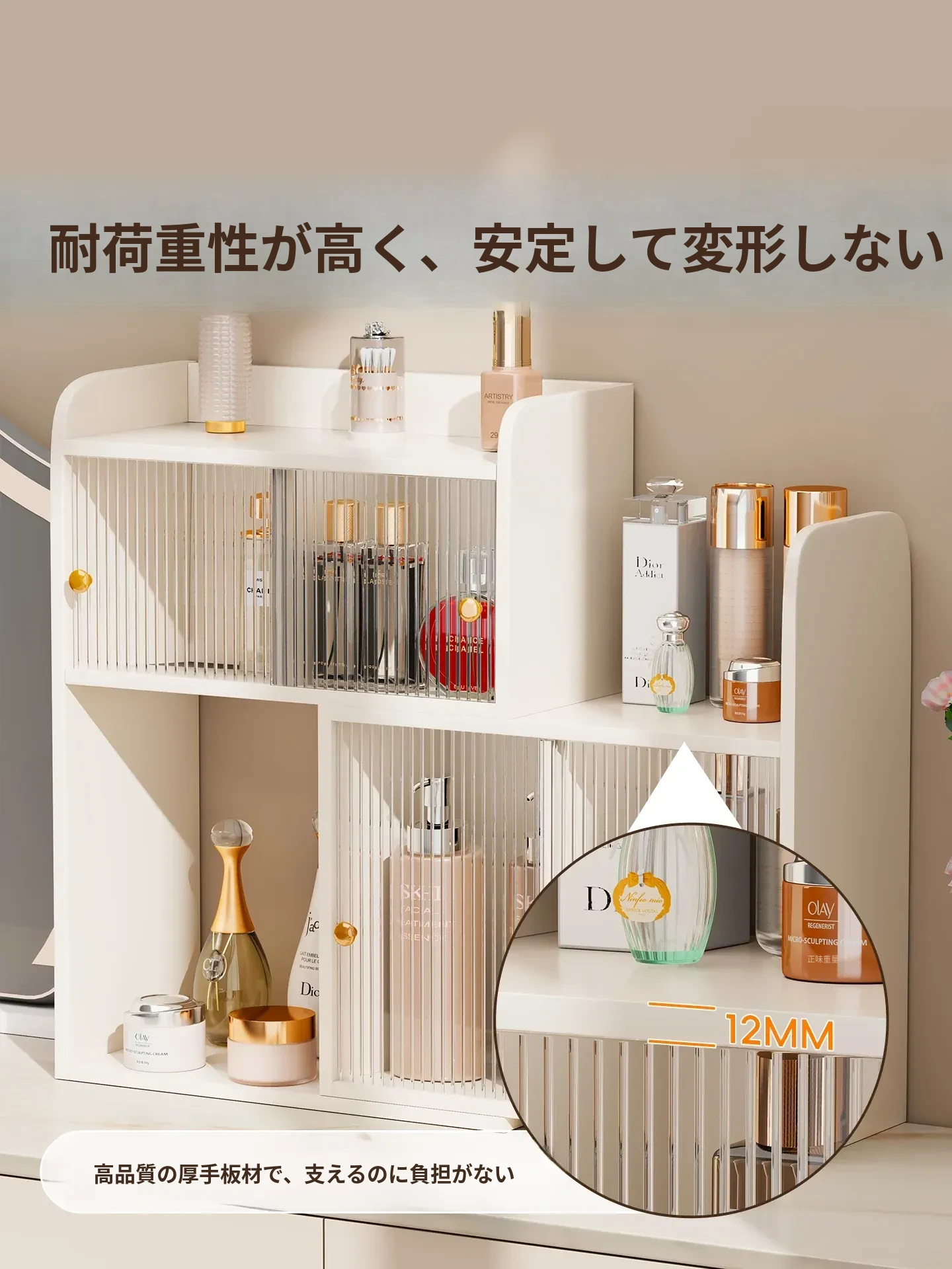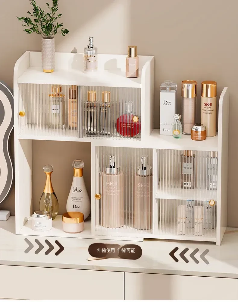 デスク用角型化粧品収納ラック - 高級感あふれるドレッサー用香水キャビネット!スキンケア製品やコスメをすっきり整理できる、スタイリッシュなカップホルダー付き収納ボックスです。