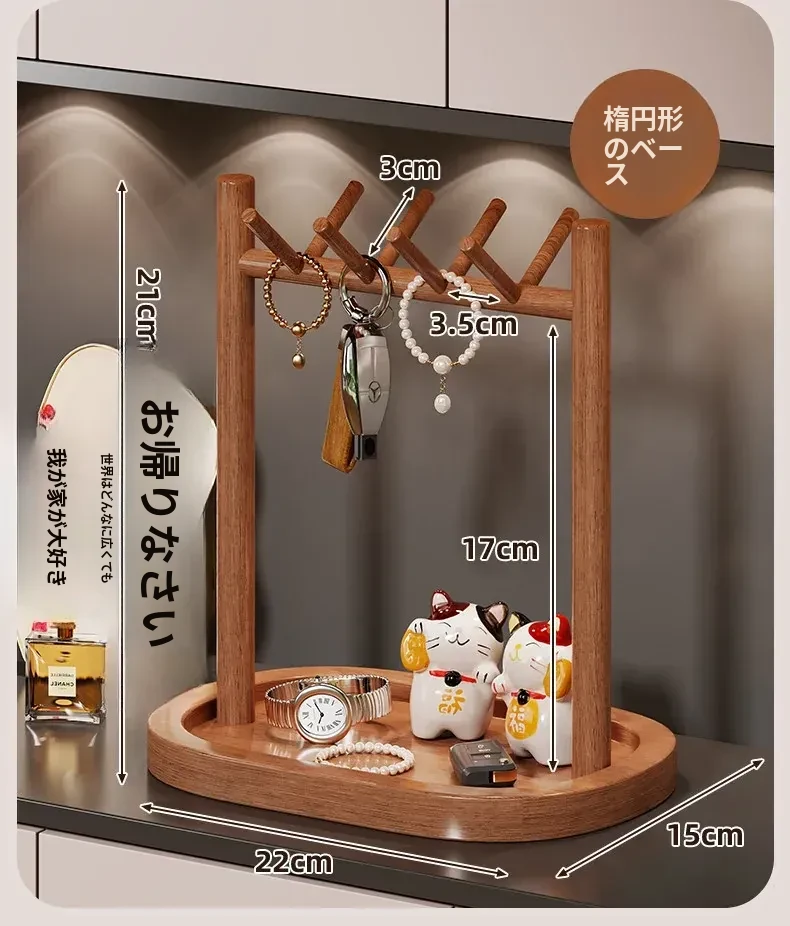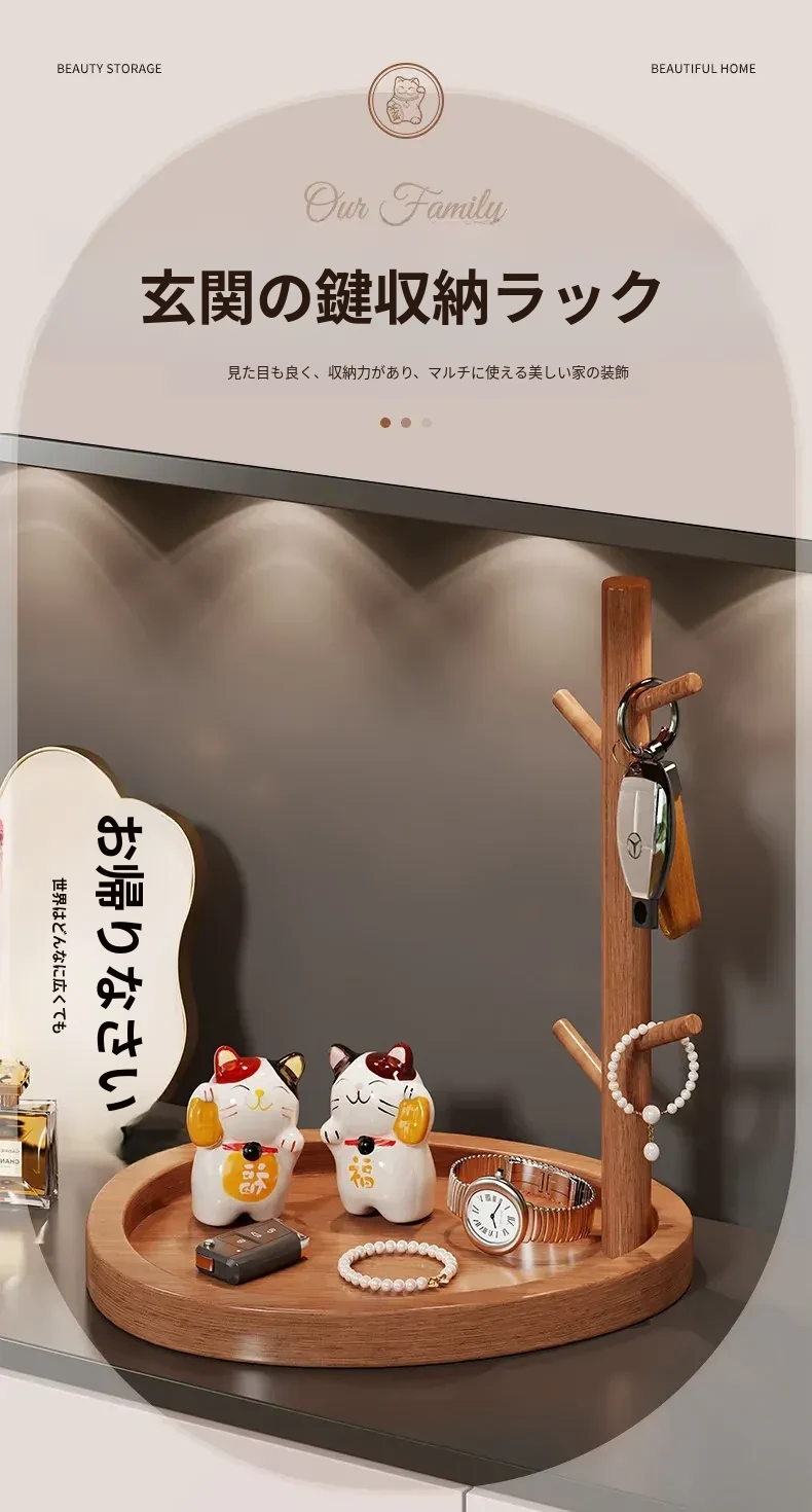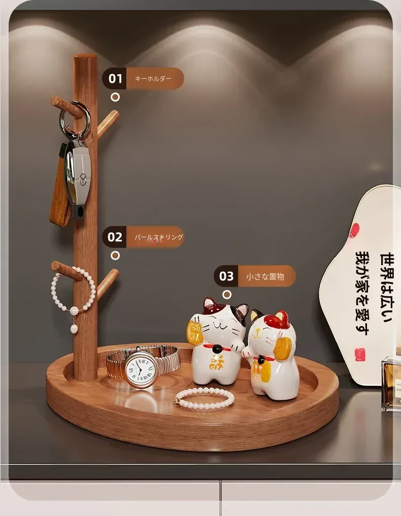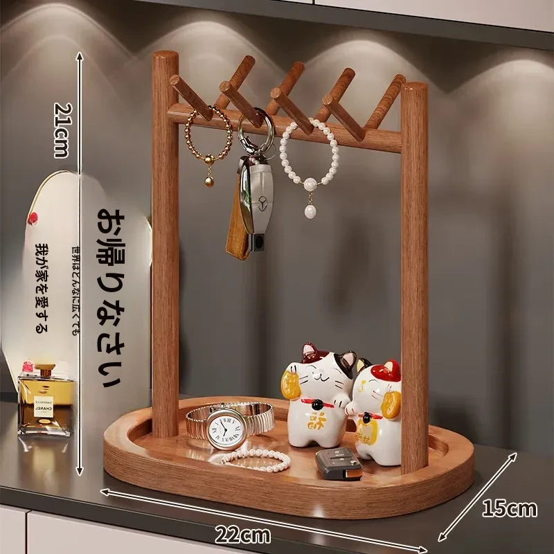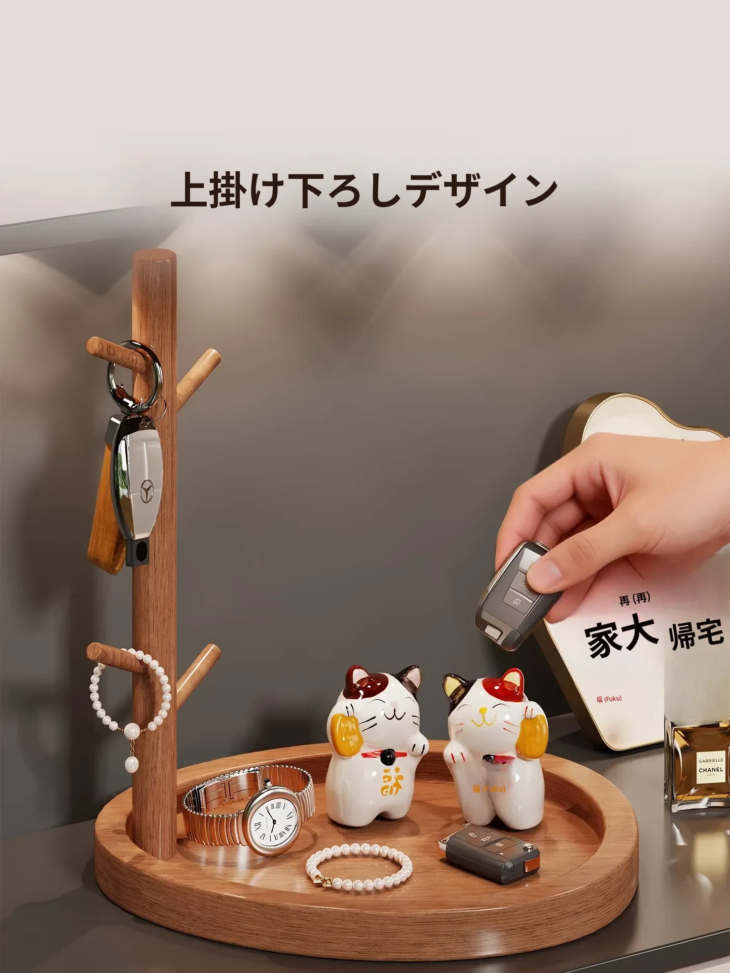高級感あふれる実木製鍵収納スタンド - 玄関や入居スペースにぴったりのデザイン!デスク上に置ける便利なアクセサリートレイ、ネックレス掛け付きで、あなたの大切なアイテムを美しく整理整頓。