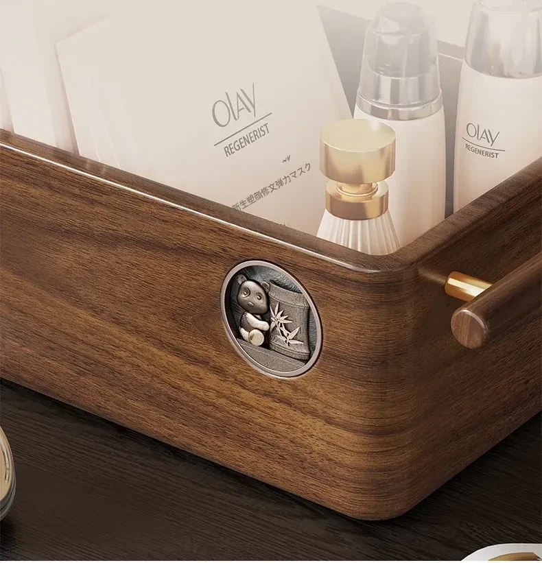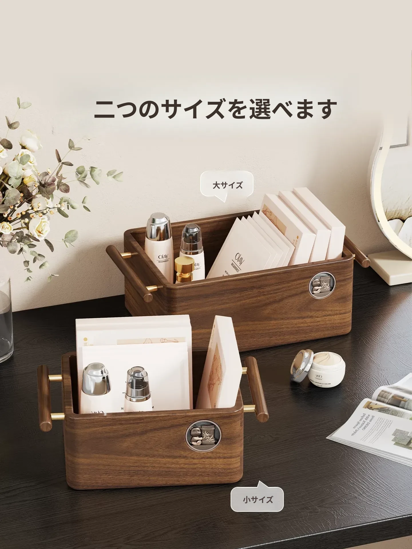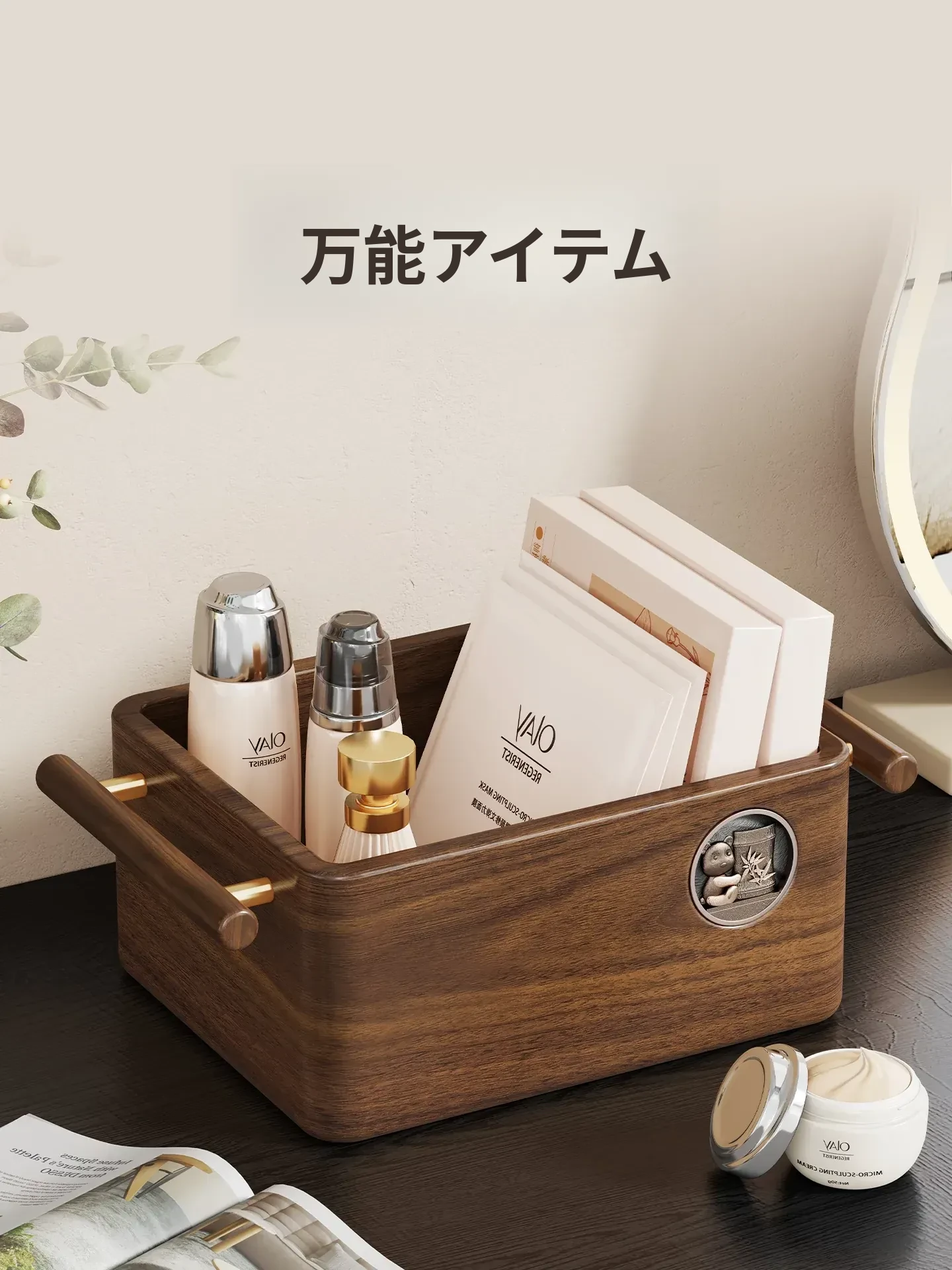 高級天然木製コスメ収納ボックス|フェイスマスク専用のスキンケア用品や化粧品を美しく整理|鏡付きで便利な洗面所デスクトップ収納ラック|おしゃれなインテリアにも最適!