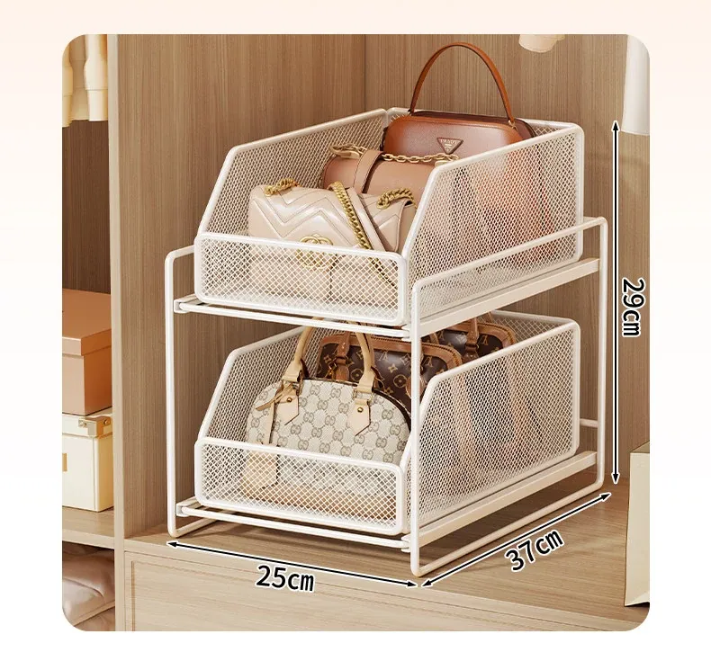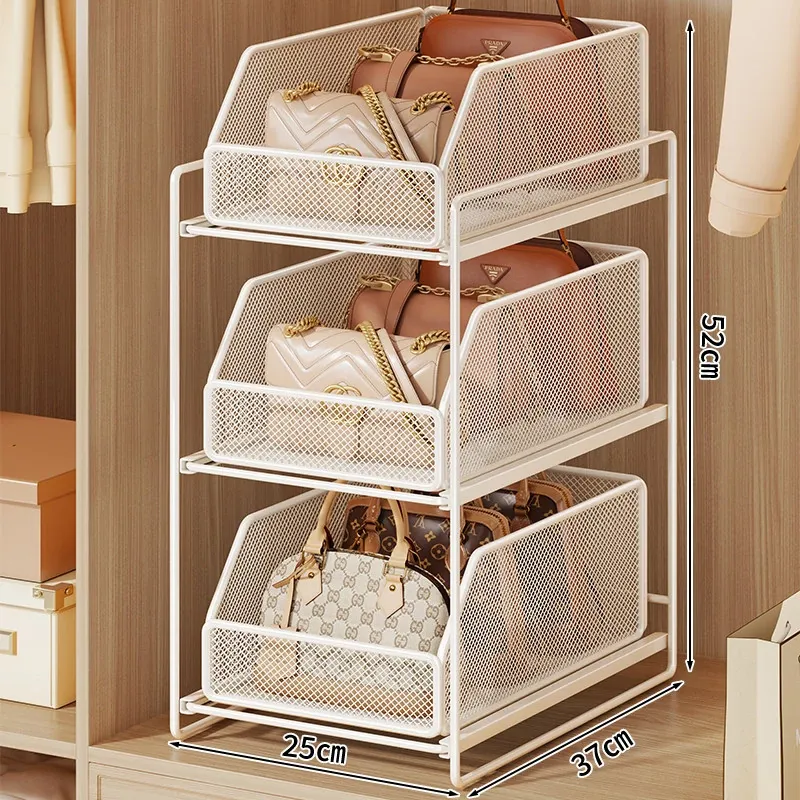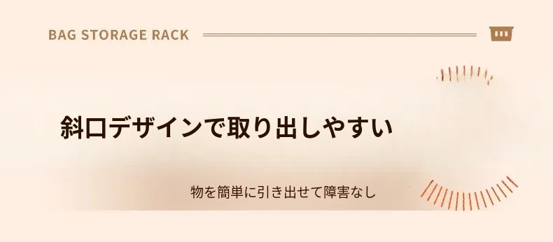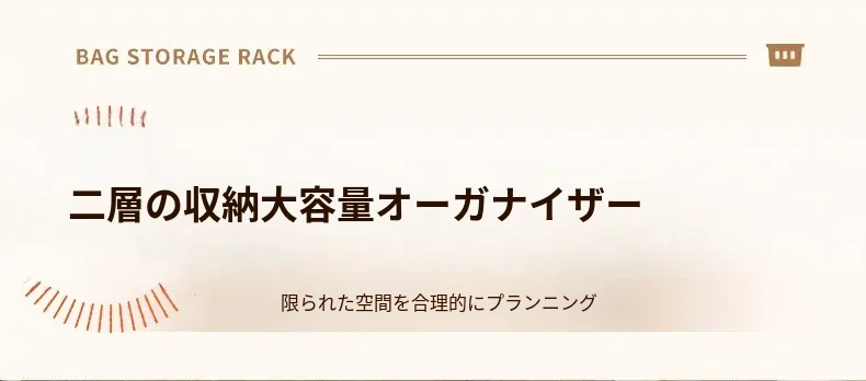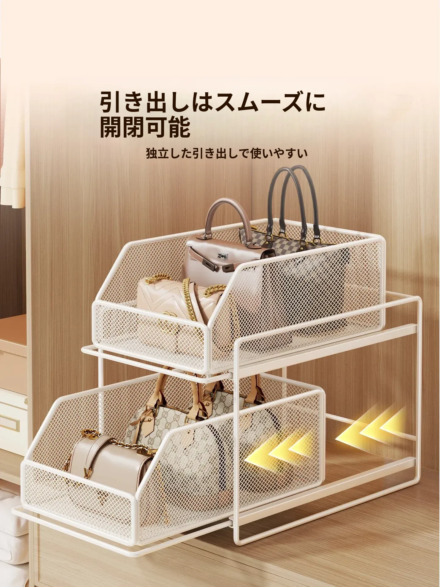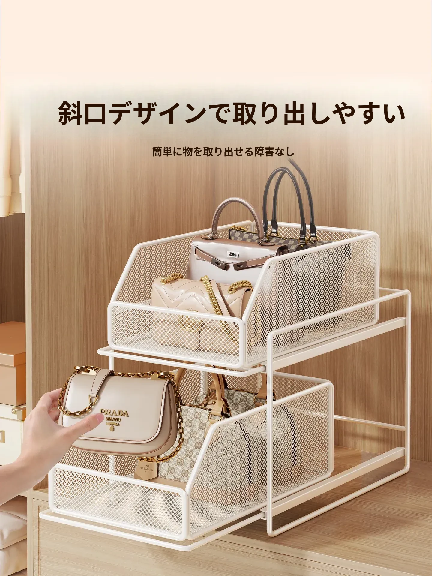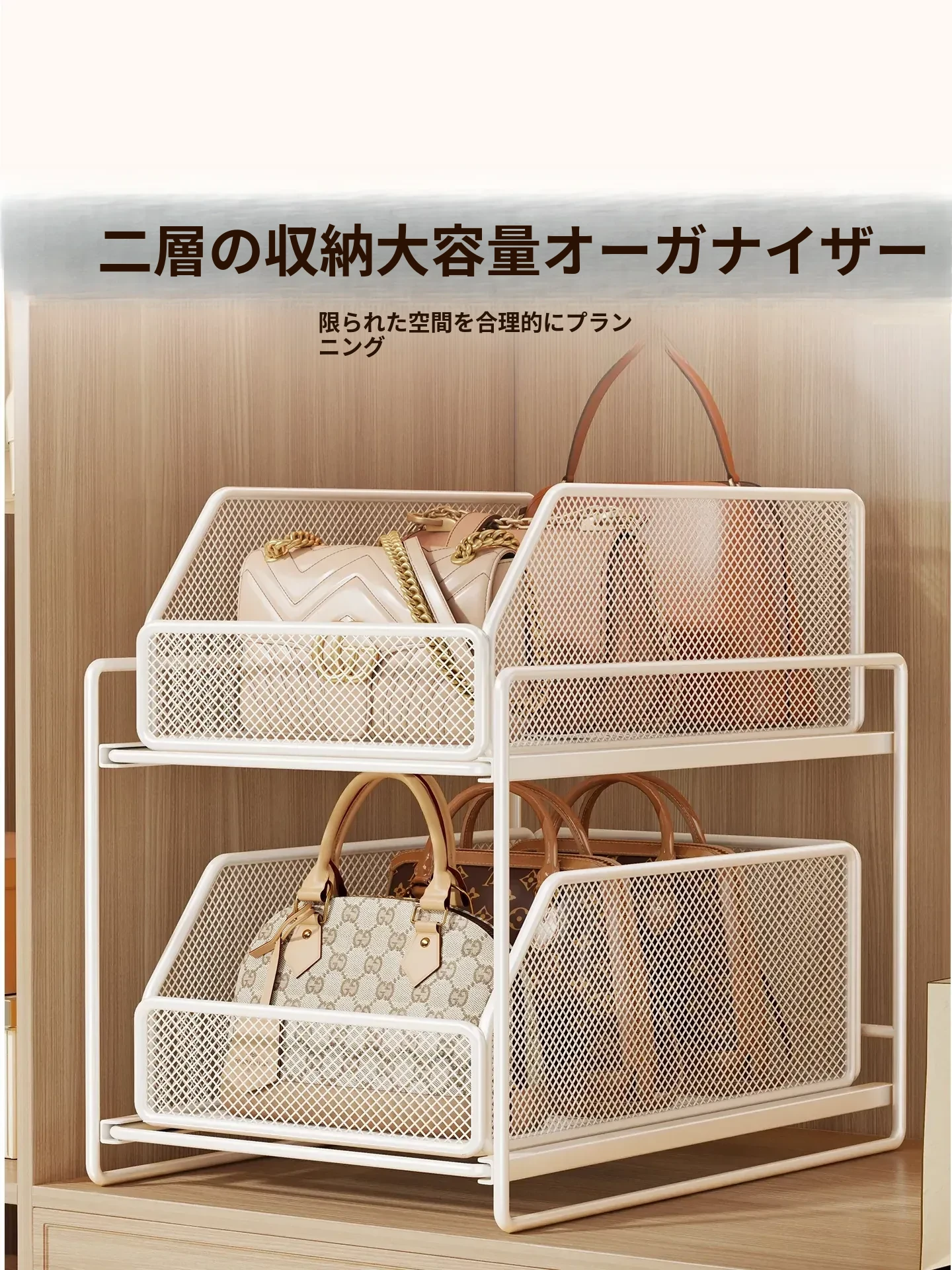 バッグ収納ラック - ハンドバッグを整理整頓!分けて収納できる便利なハンギングシェルフで、バッグをすっきり整頓。クローゼット内もスッキリ!収納ボックスとしても使える多機能アイテムです。