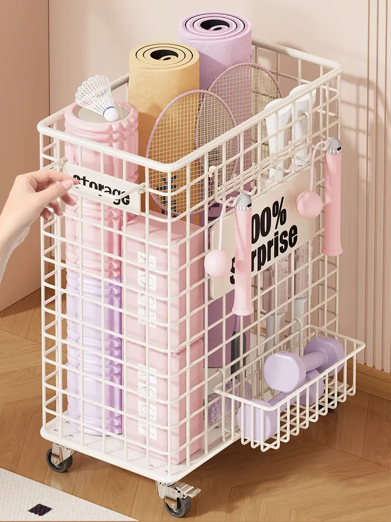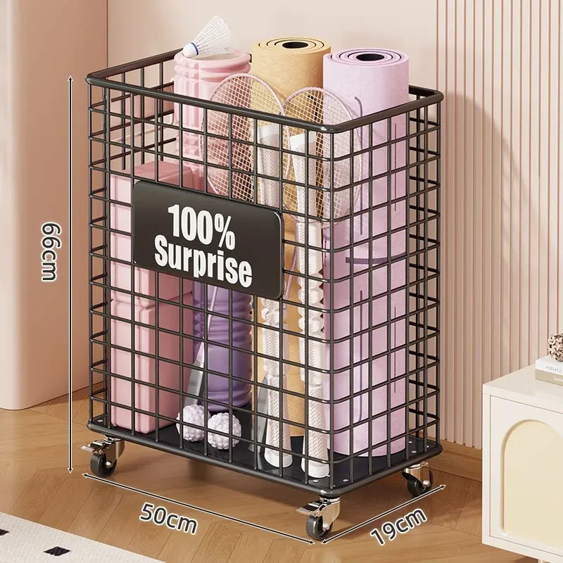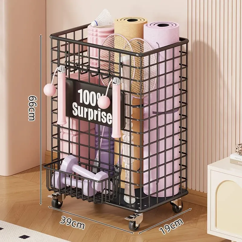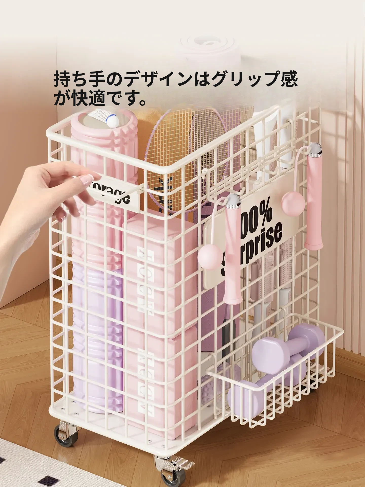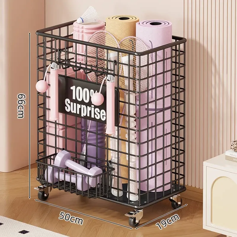 大容量フィットネス器具収納ラック - 移動可能なキャスター付き!バドミントンやヨガマットも楽々収納できる隙間活用のアイテム!家庭での整理整頓に最適です!