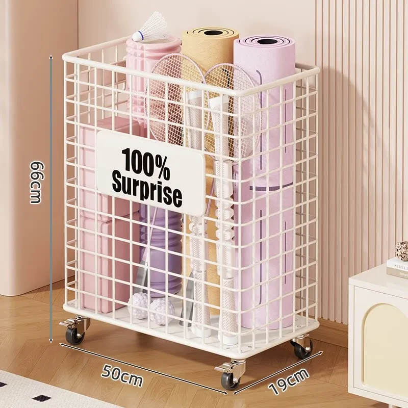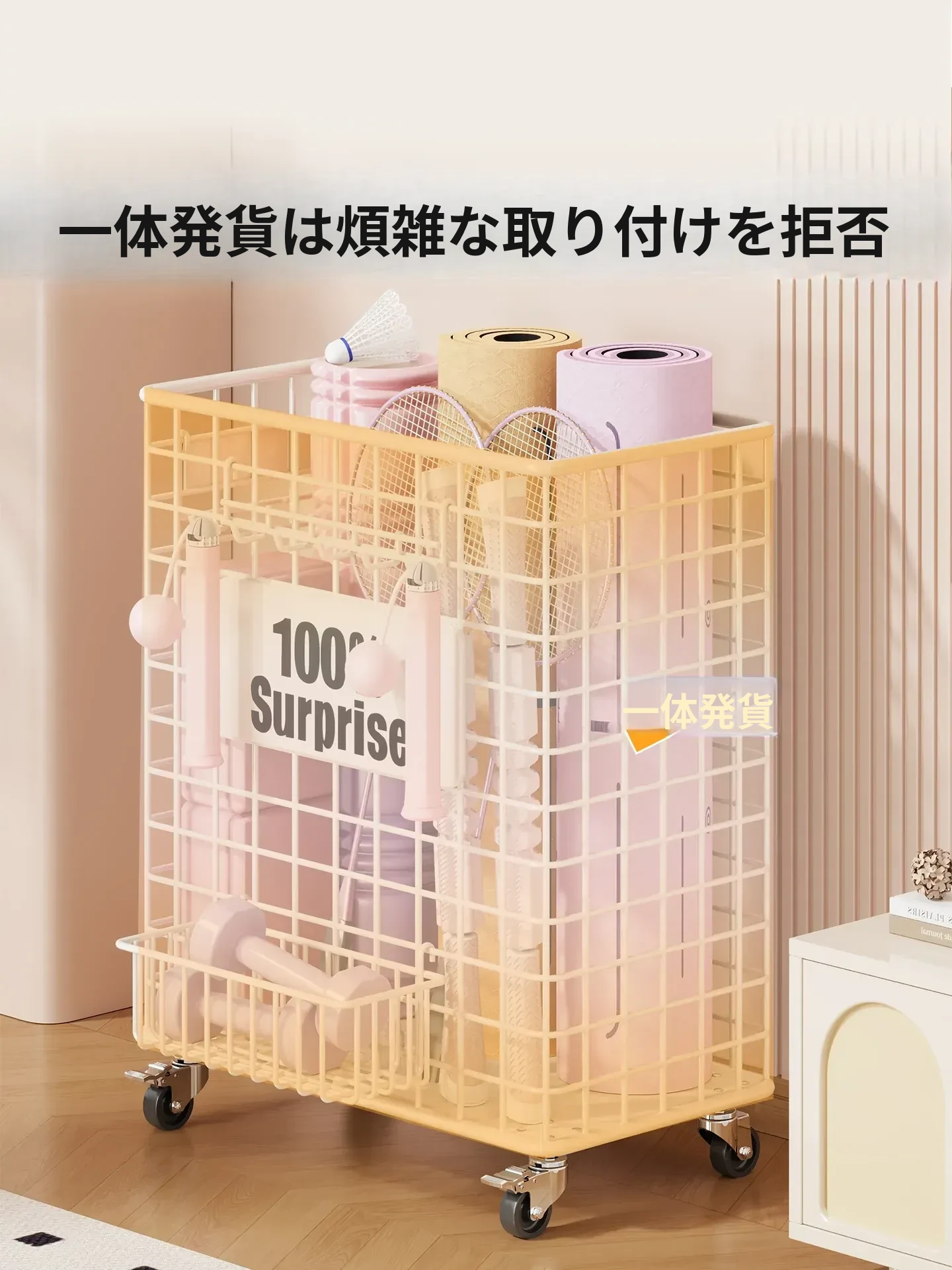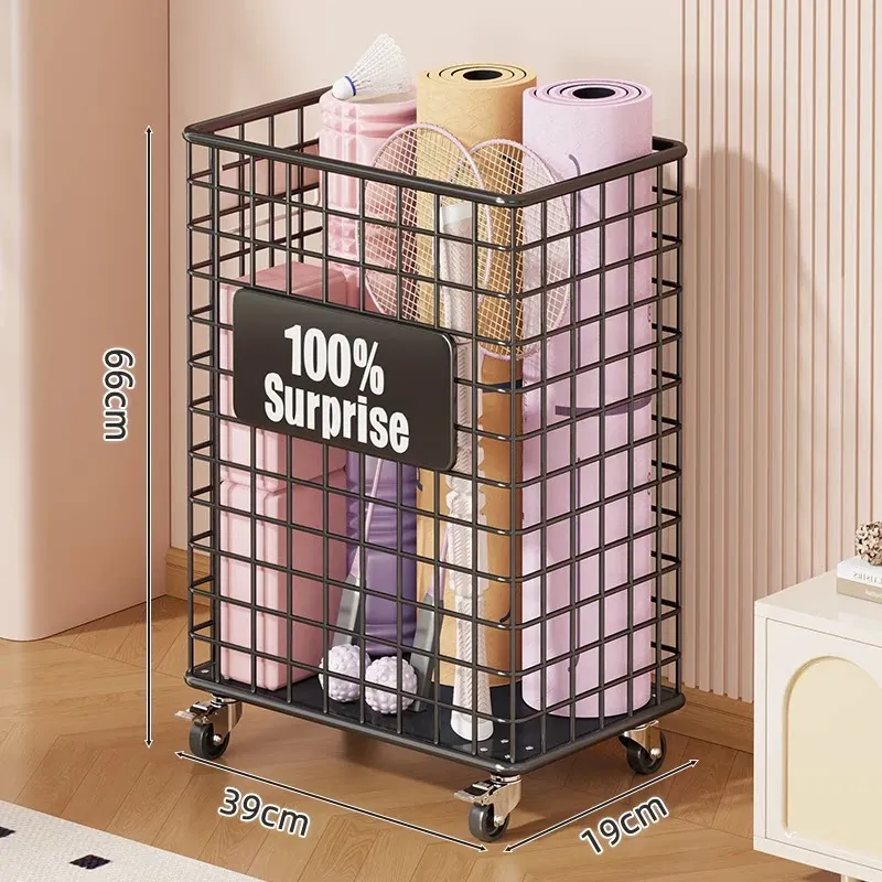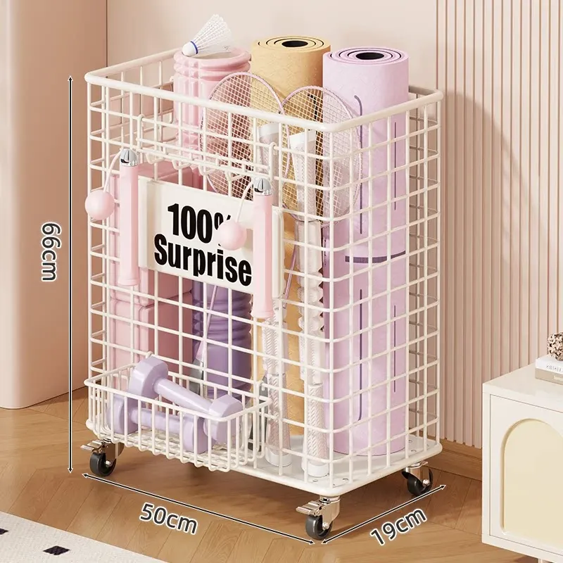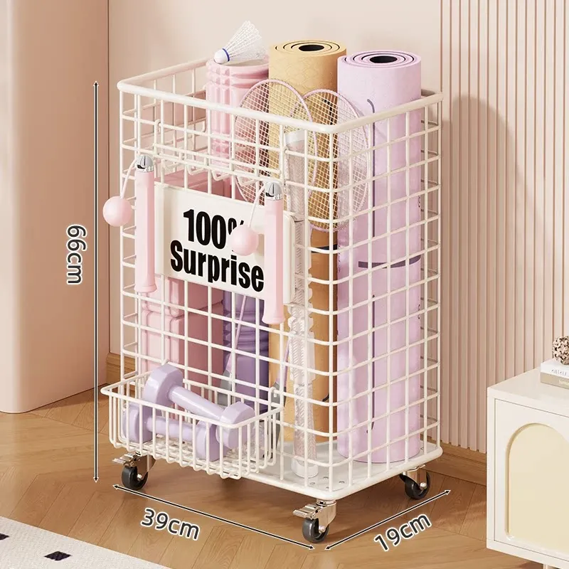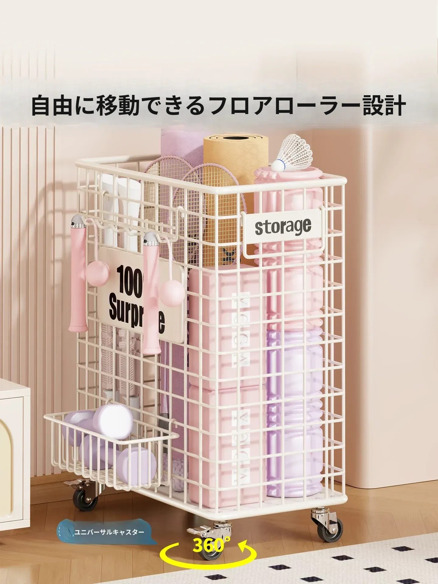大容量フィットネス器具収納ラック - 移動可能なキャスター付き!バドミントンやヨガマットも楽々収納できる隙間活用のアイテム!家庭での整理整頓に最適です!