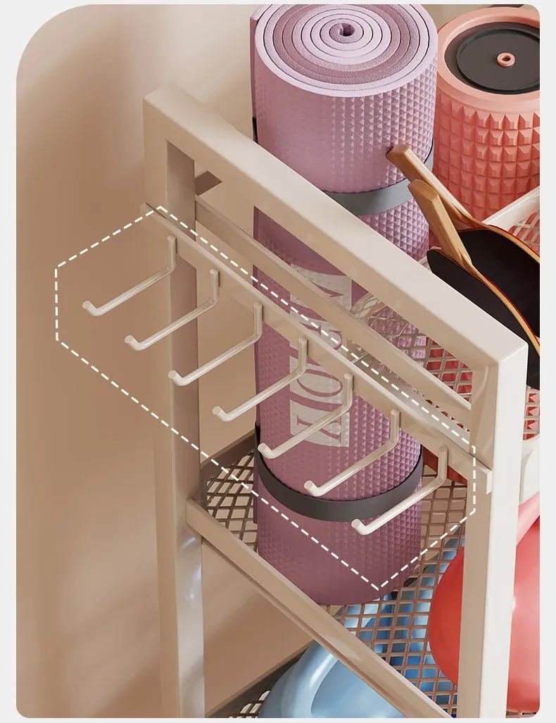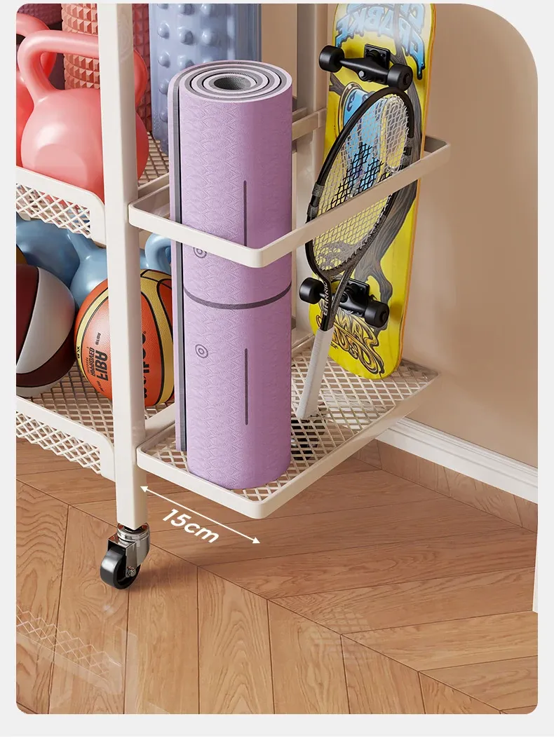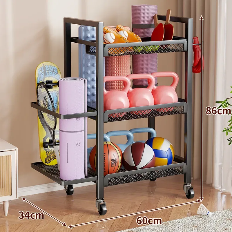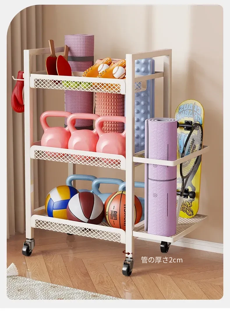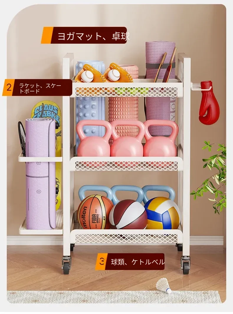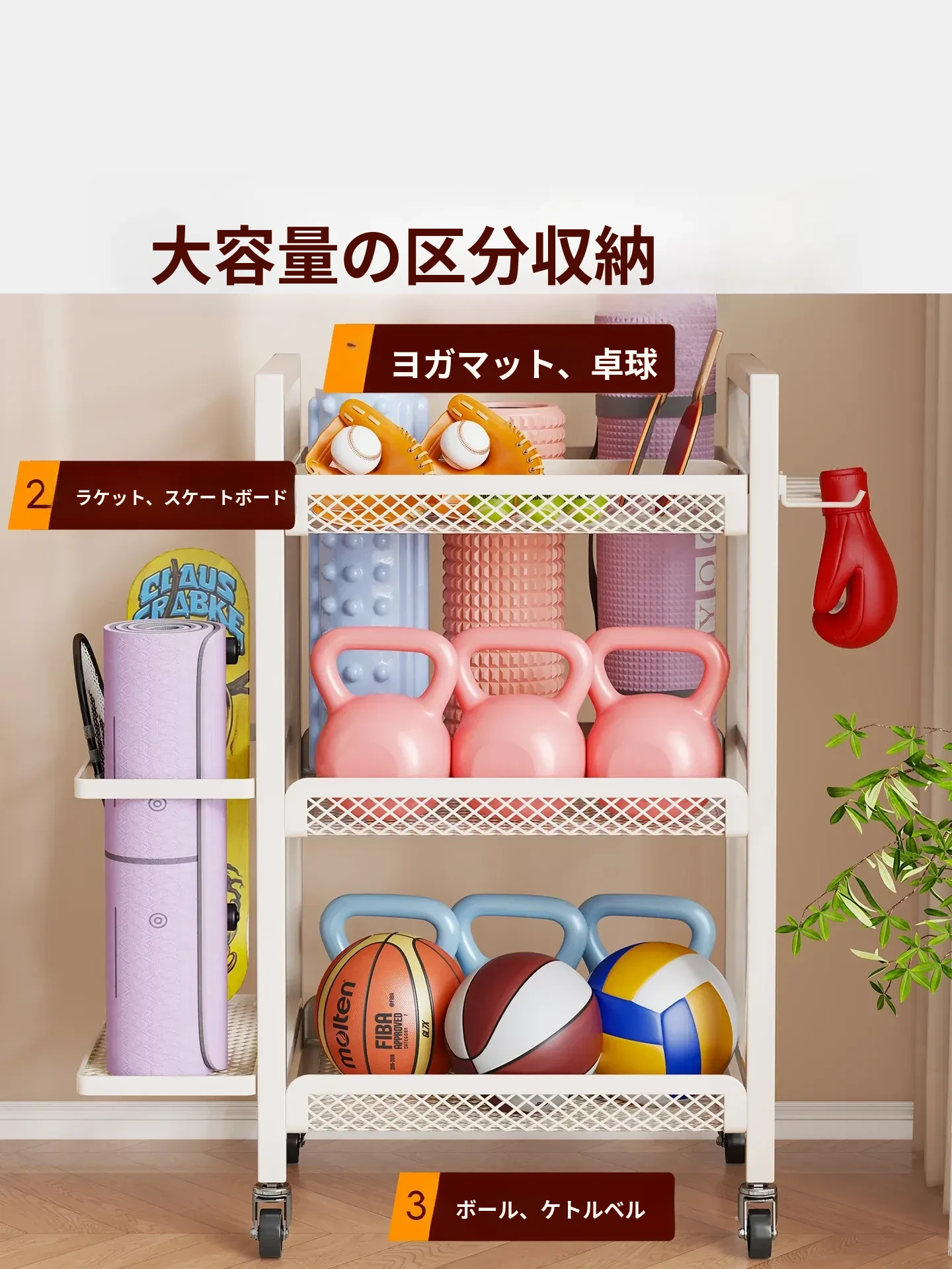 家庭用大容量フィットネス器具収納ラック - 移動可能なヨガマット、ダンベル、ケトルベルなどの運動道具をスッキリ整理!あなたのトレーニングスペースを効率的に活用しましょう!