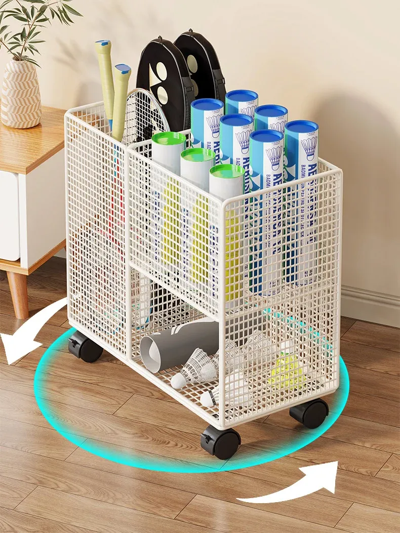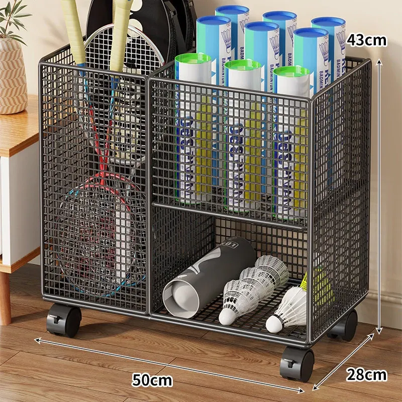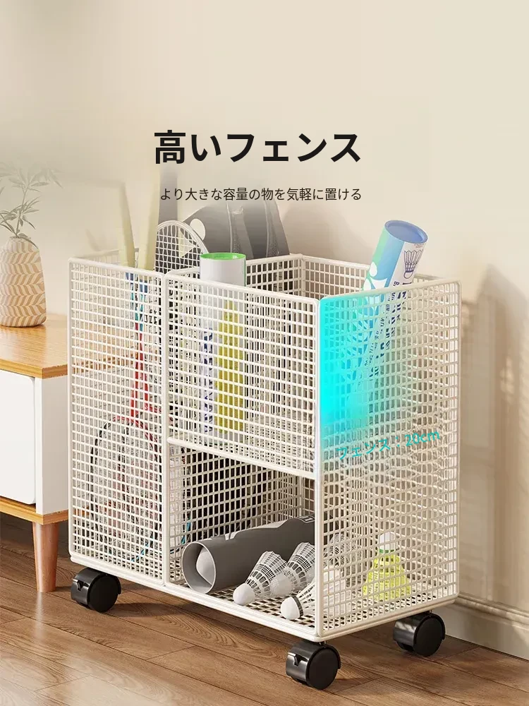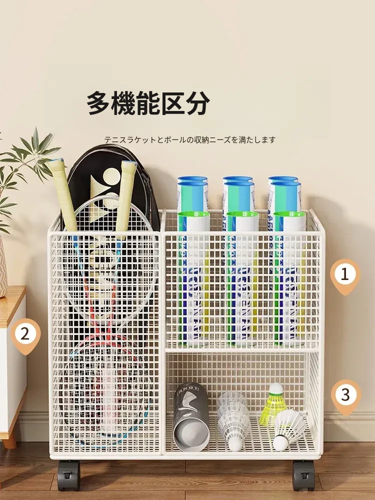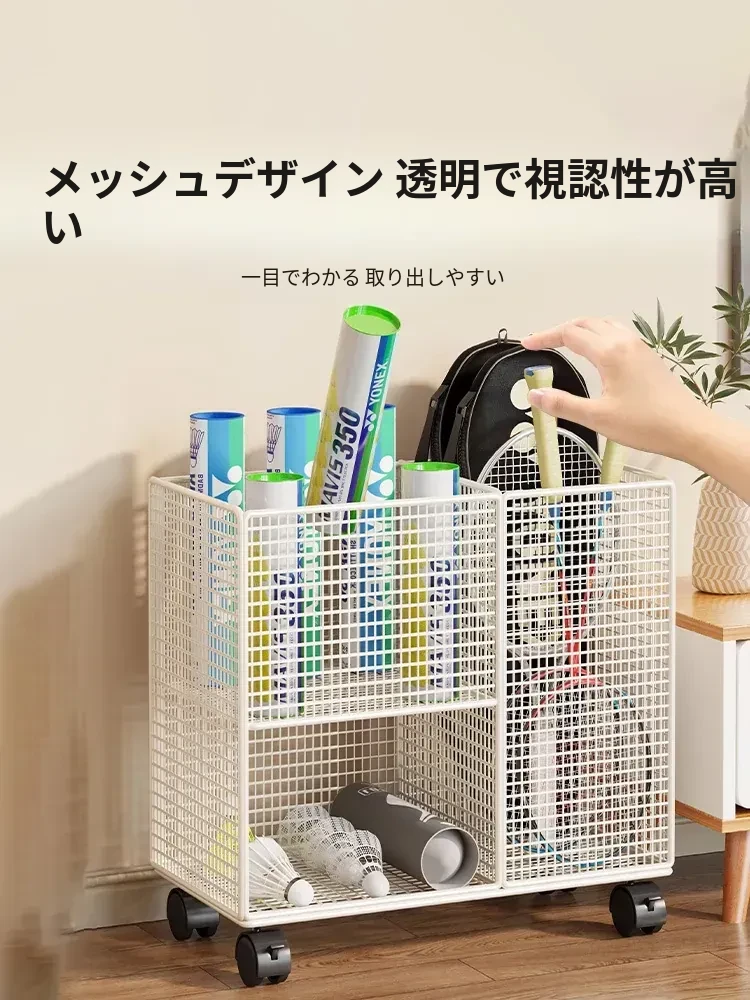 移動式バドミントンラケット収納ラック - 大容量ヨガマット収納バスケットで、フィットネス器具もスッキリ整理!快適な家でのトレーニングをサポートします!