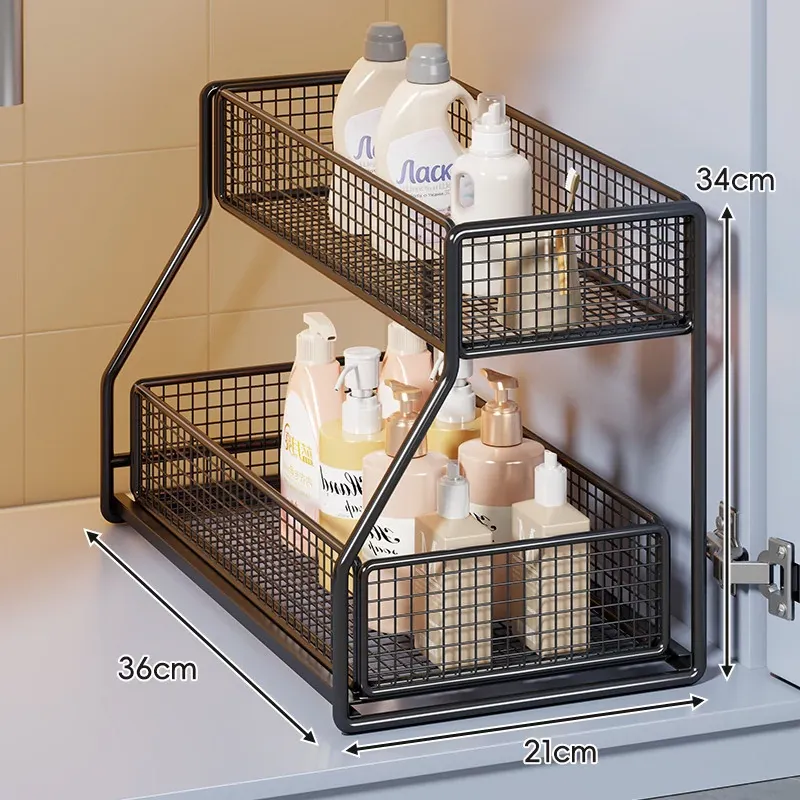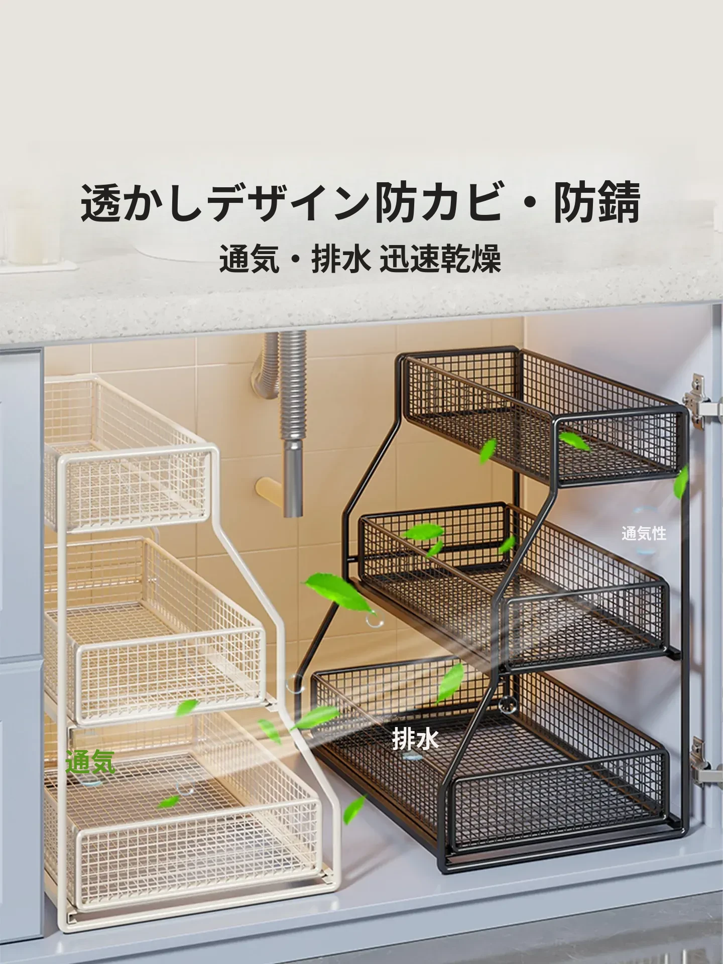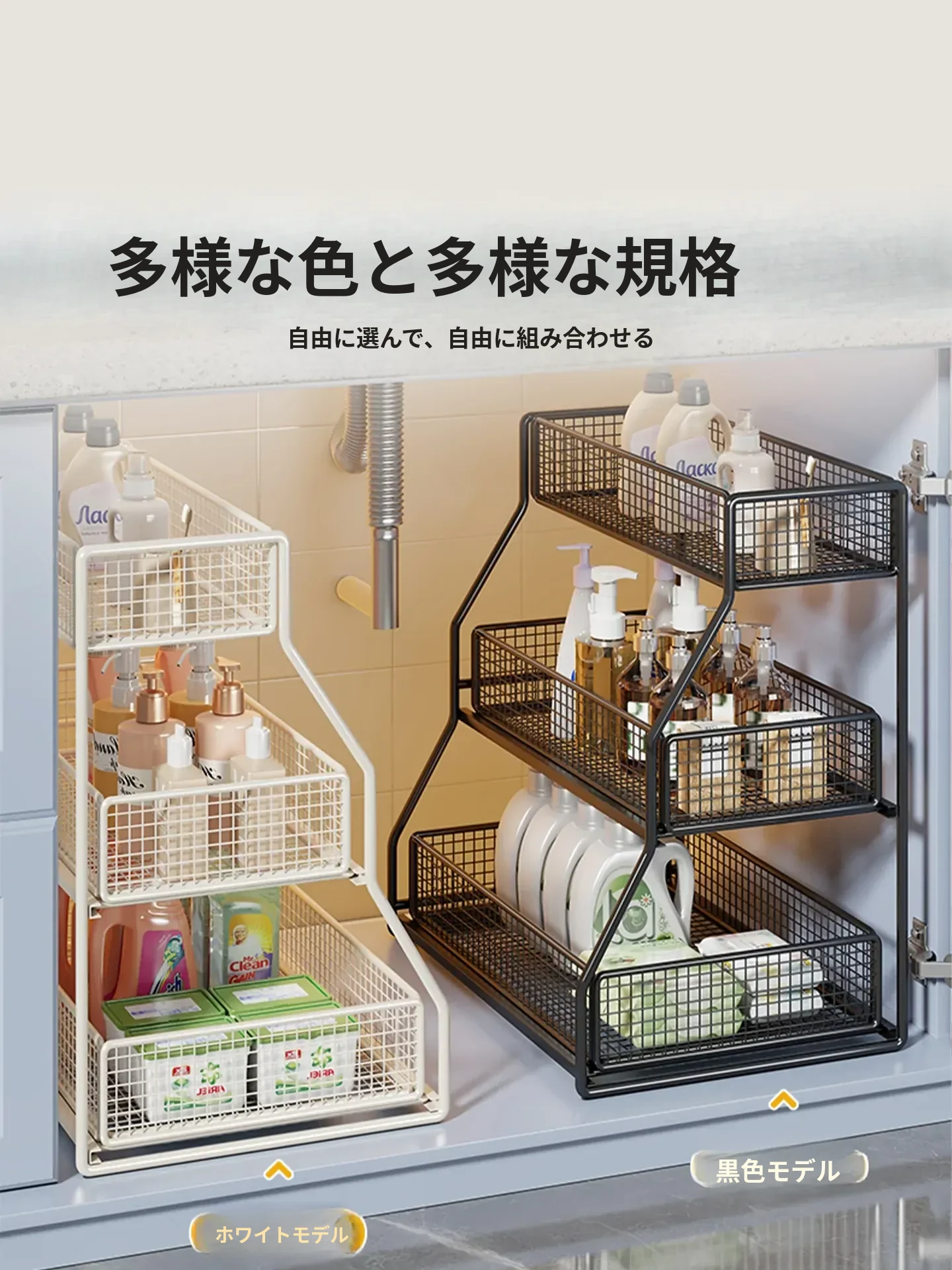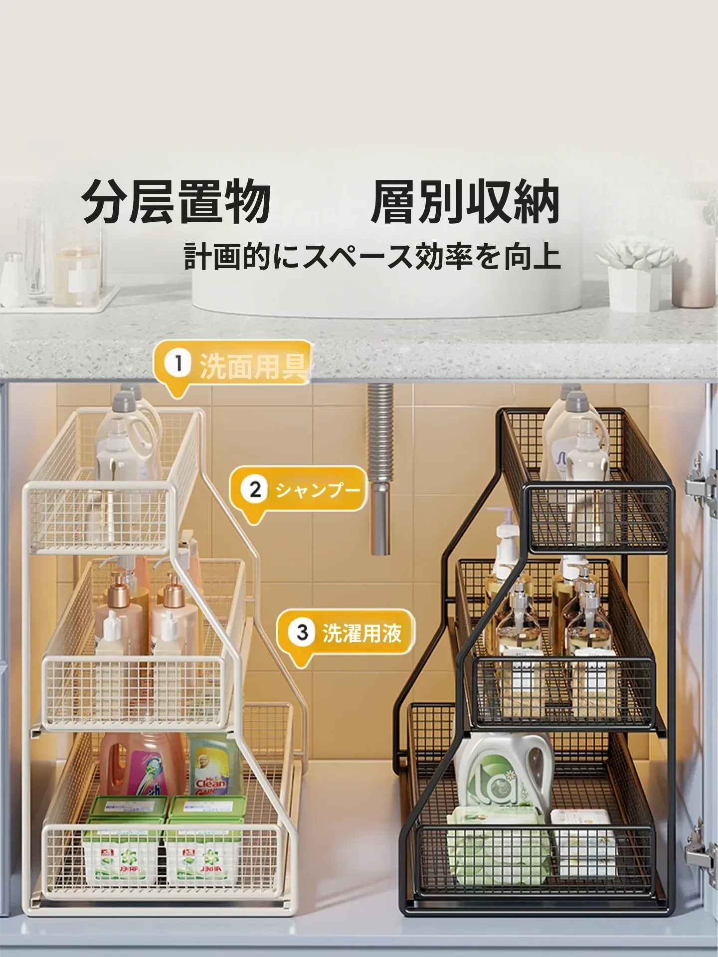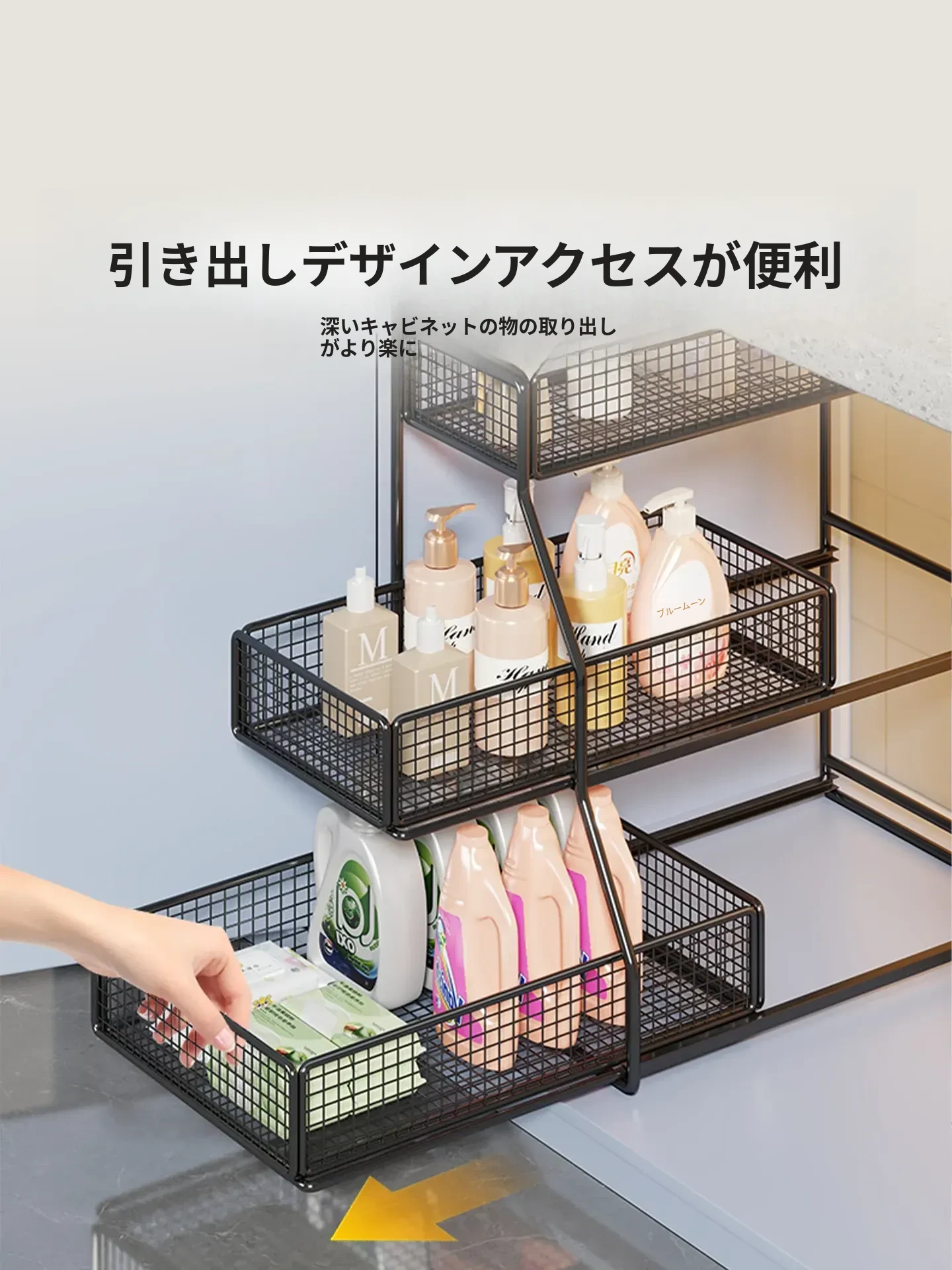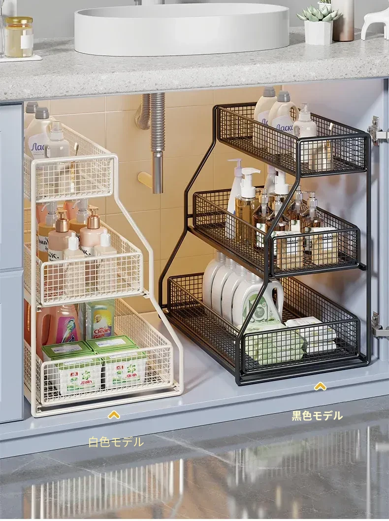 シンク下収納ラック・洗面台用キャビネット内に最適な引き出し式収納棚!バスルームや洗濯用洗剤の整理に最適な多機能ラバスケットで、スペースを有効活用!