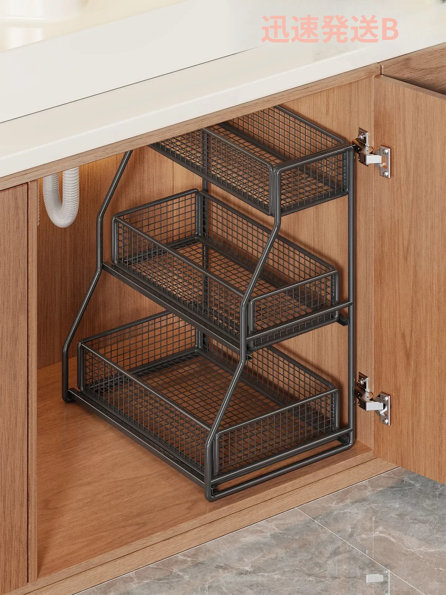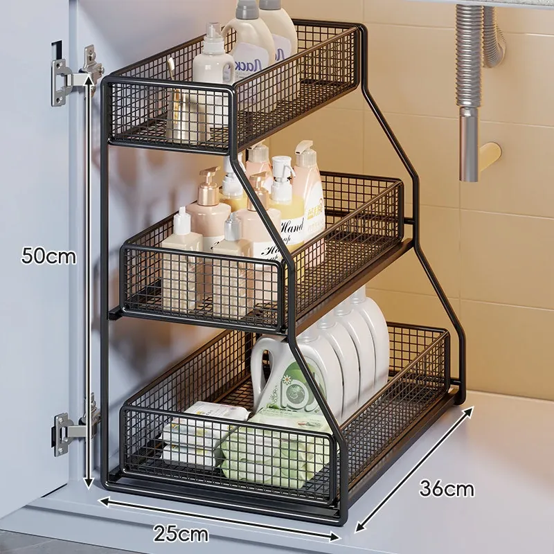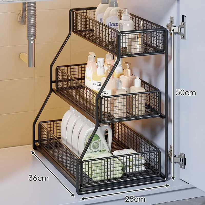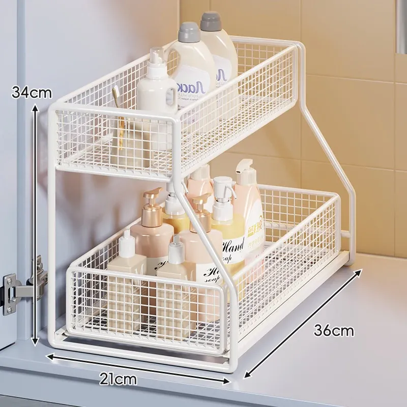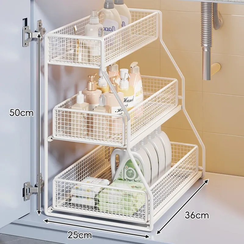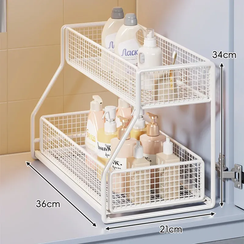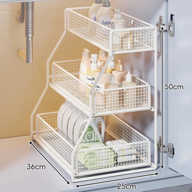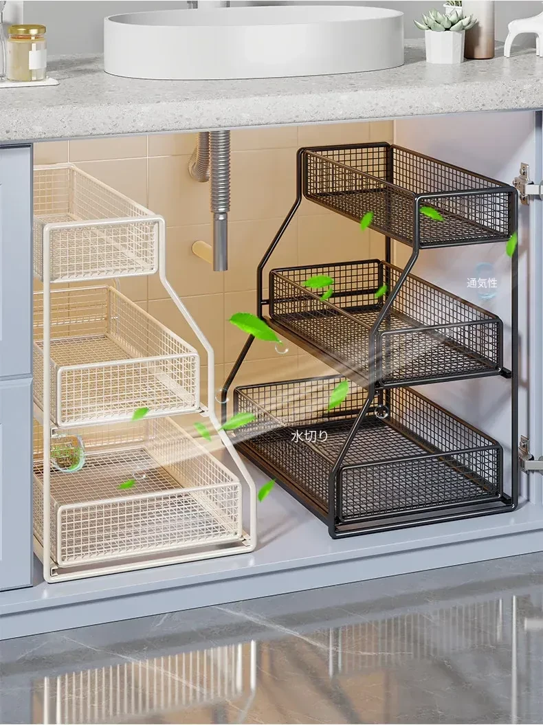 シンク下収納ラック・洗面台用キャビネット内に最適な引き出し式収納棚!バスルームや洗濯用洗剤の整理に最適な多機能ラバスケットで、スペースを有効活用!