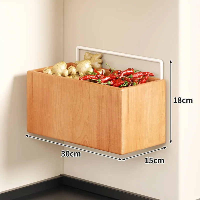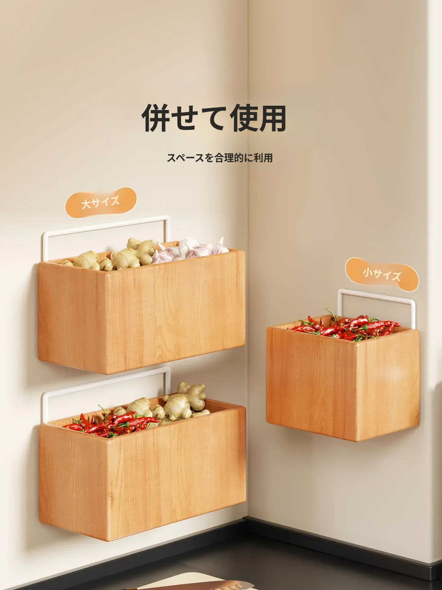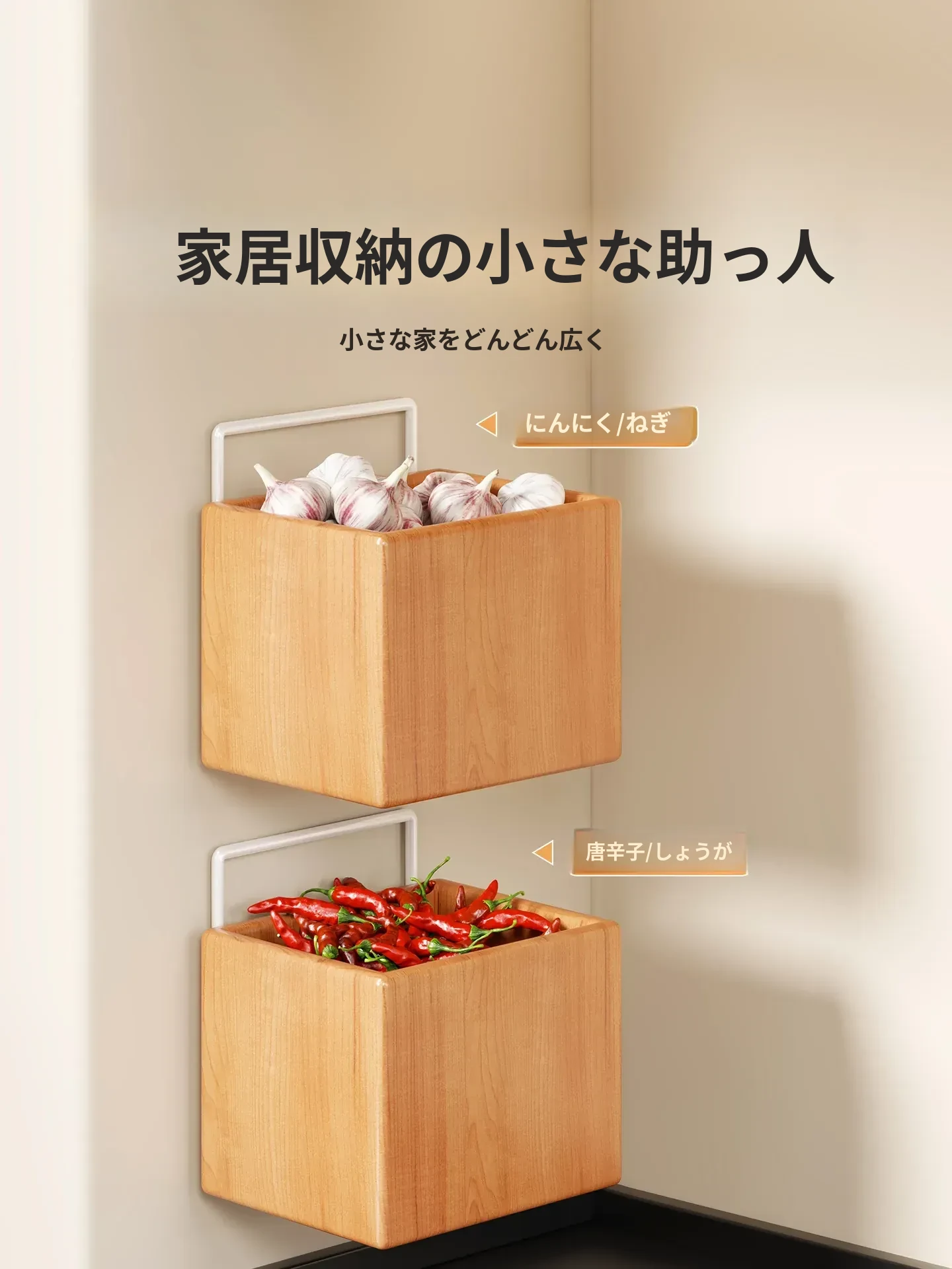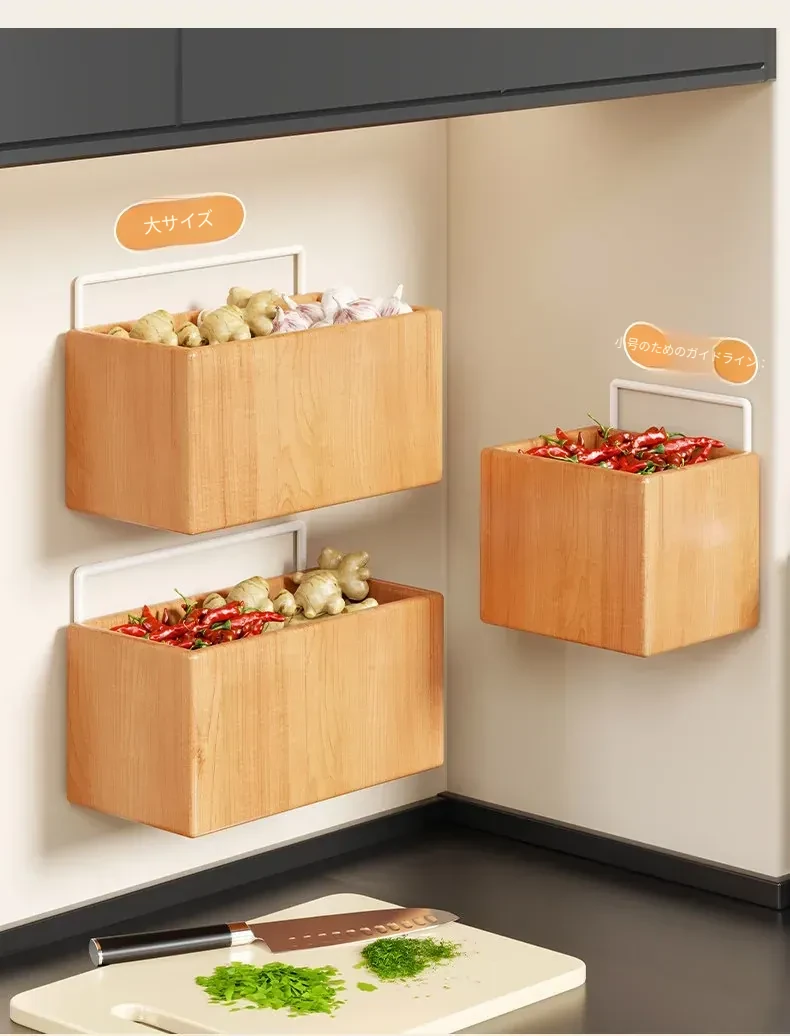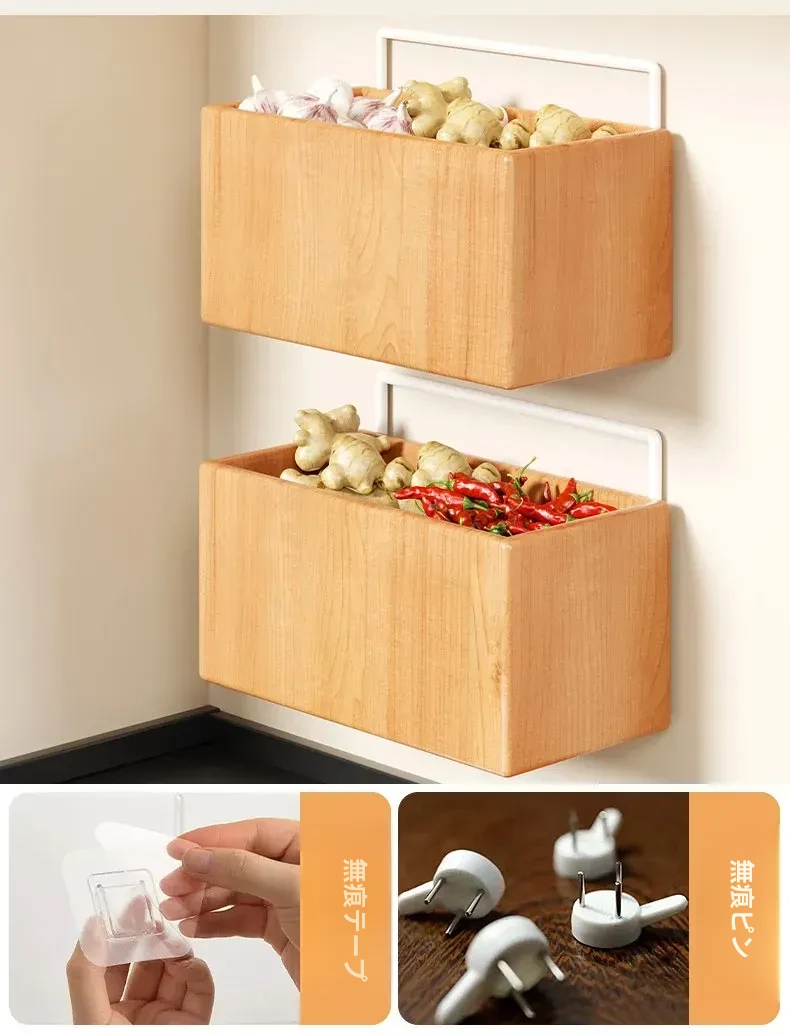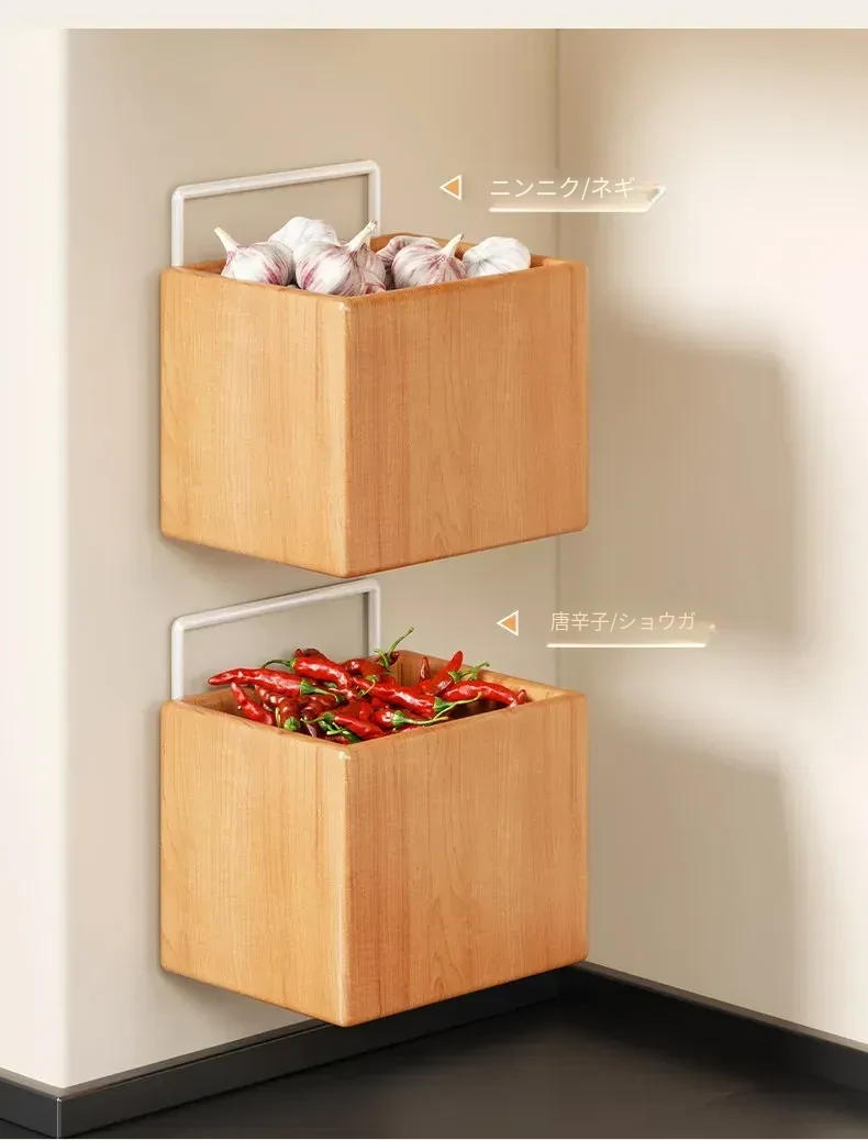無垢材のキッチン用生姜・にんにく収納バスケット - 中古風の壁掛けバスケット、ナチュラルな原木色で、壁に取り付けて葱・にんにく・卵をおしゃれに収納!キッチンをスッキリさせる必須アイテム!