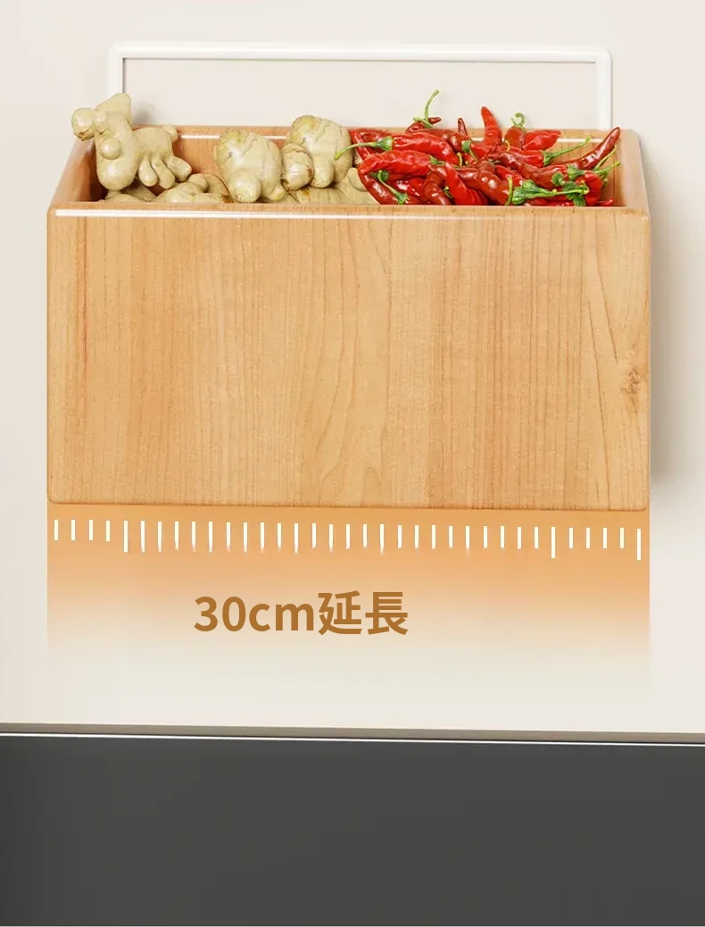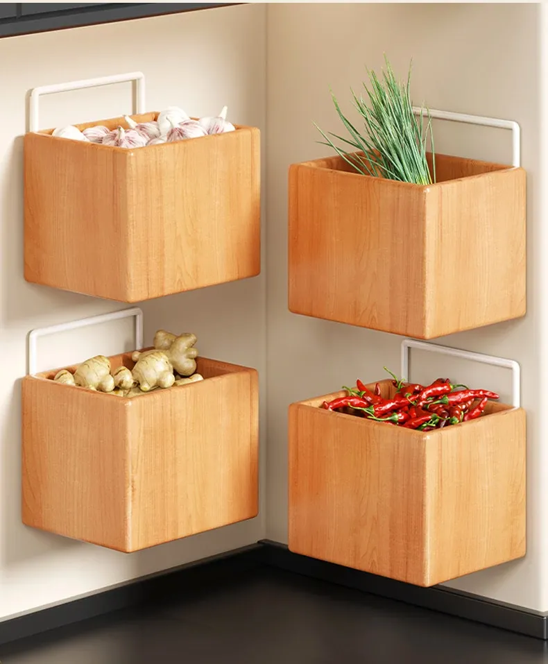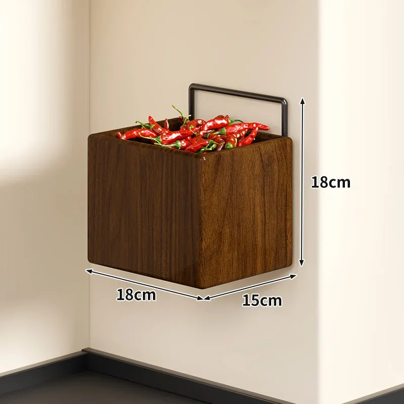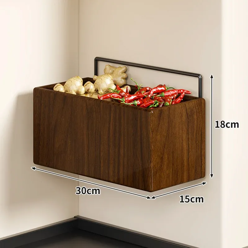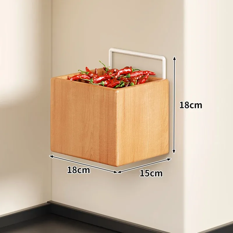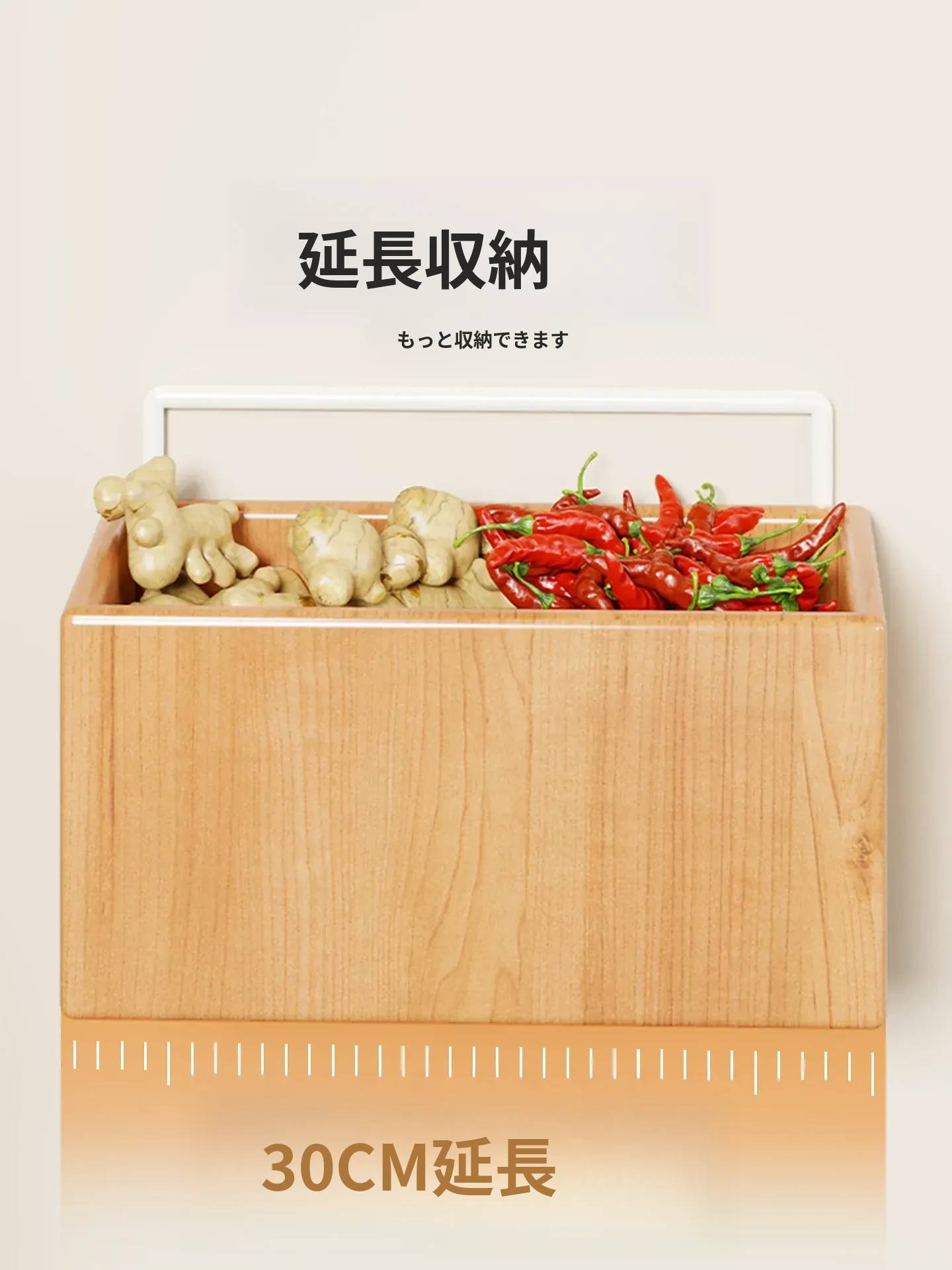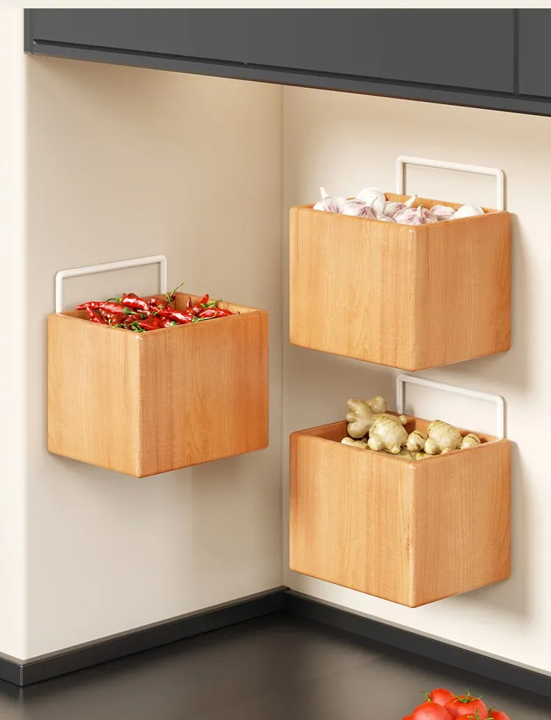 無垢材のキッチン用生姜・にんにく収納バスケット - 中古風の壁掛けバスケット、ナチュラルな原木色で、壁に取り付けて葱・にんにく・卵をおしゃれに収納!キッチンをスッキリさせる必須アイテム!