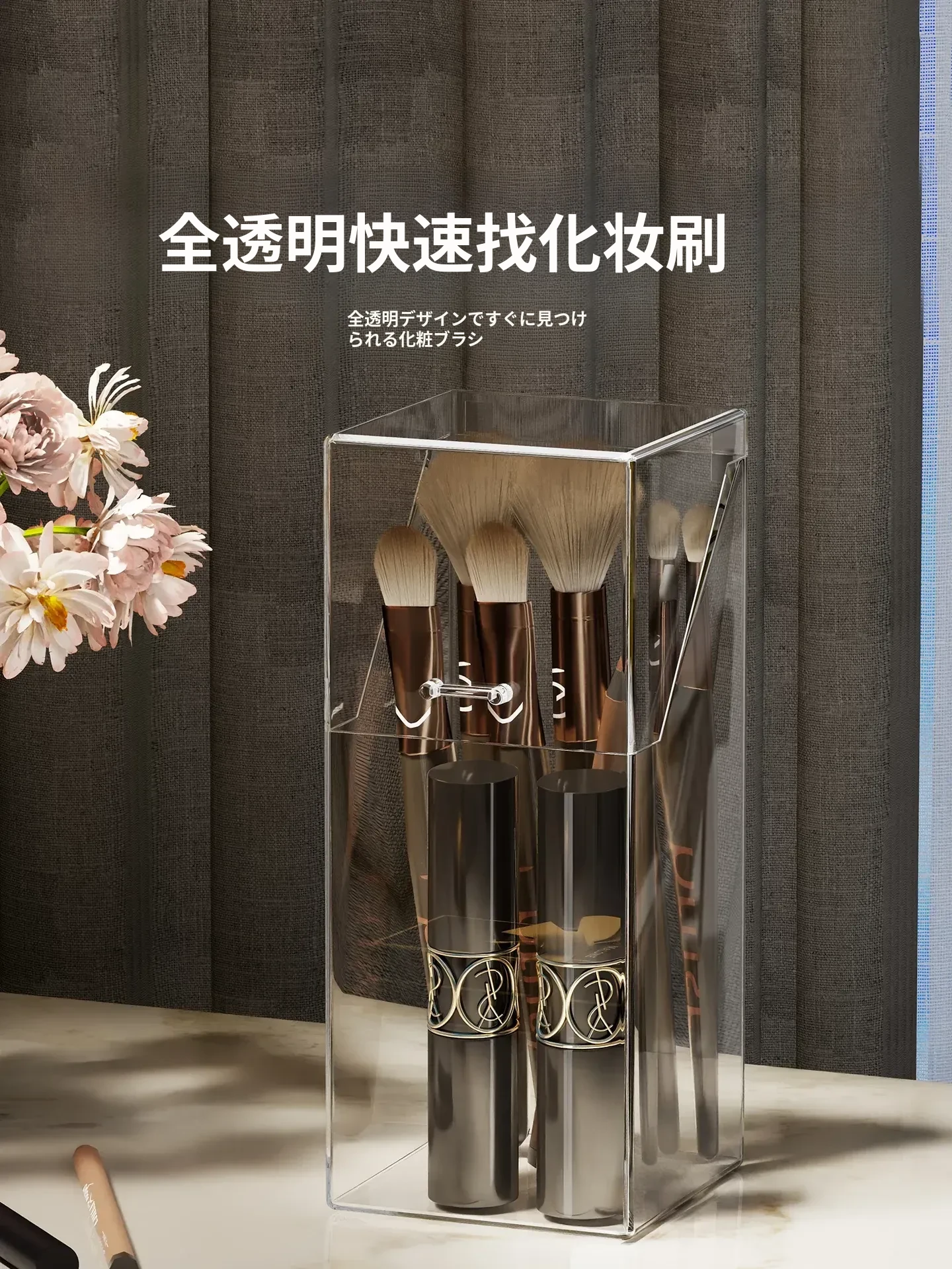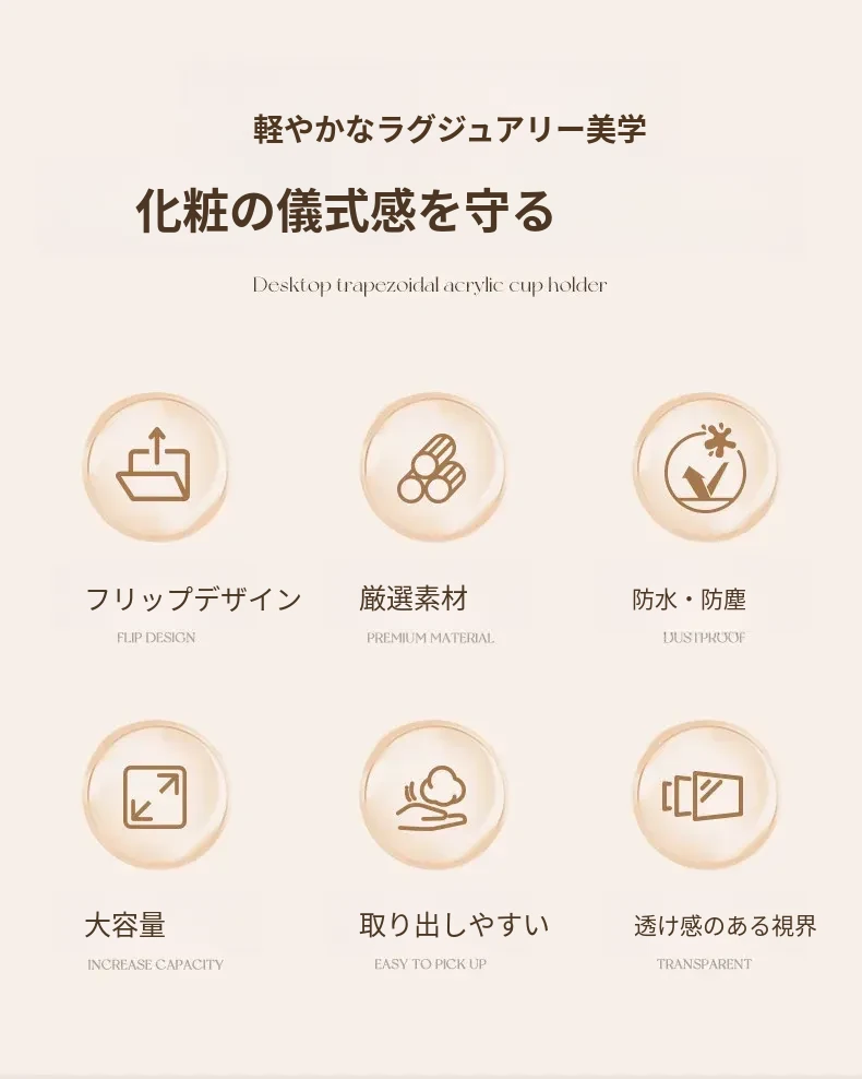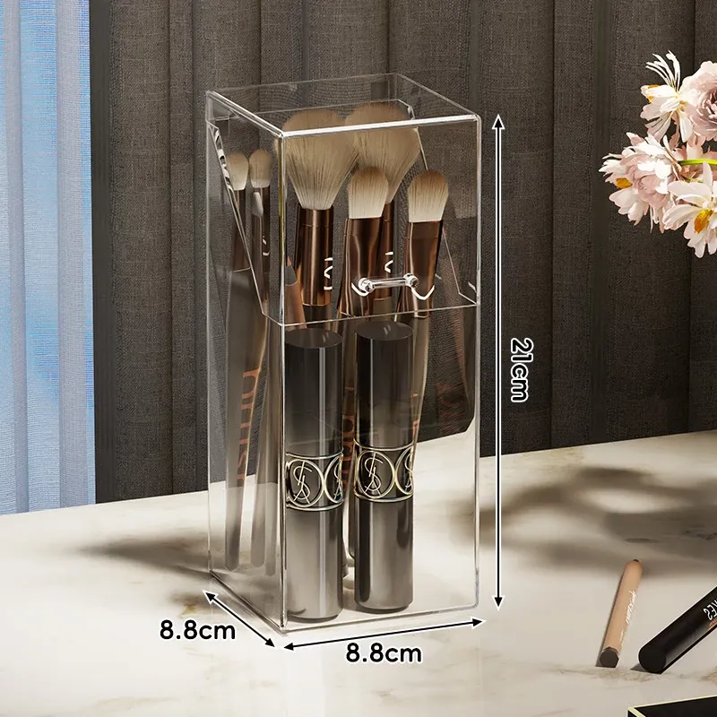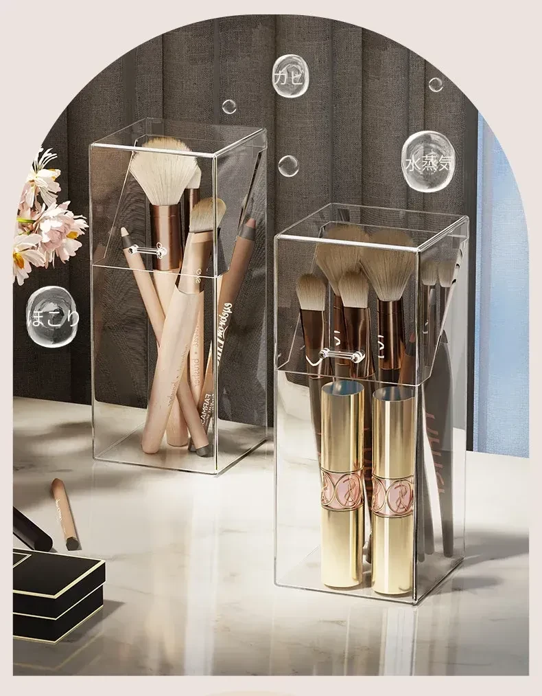 メイクブラシ収納ボックス - 蓋付きの透明な整理筒で、アイシャドウブラシやリップスティックをすっきりと整理!ホコリから守り、美しいドレッサーを演出します。おしゃれで実用的な収納アイテムです!