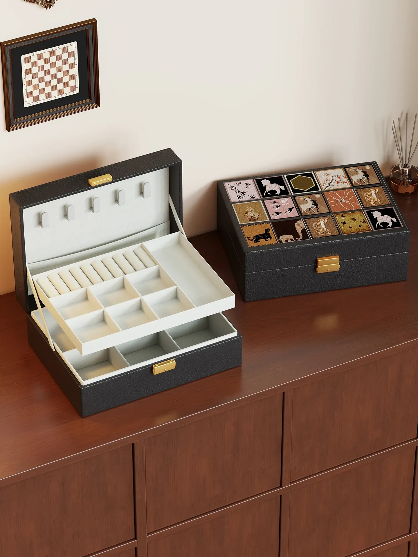高級感溢れる大容量ジュエリーボックス - ピアス、イヤリング、リング、ネックレスを美しく収納できるデザイン性抜群のレザー製ボックス!あなたの大切なアクセサリーを贅沢に守ります。