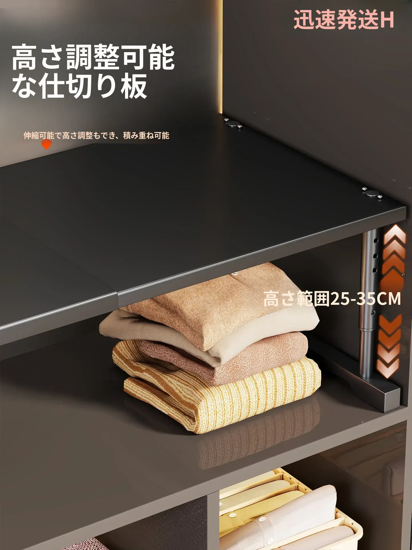 伸縮可能な衣類収納棚 - 便利な分層収納で、クローゼットやキッチンをスッキリ整理!積み重ね可能なデザインで、スペースを有効活用し、あなたの生活空間をもっと快適にします!